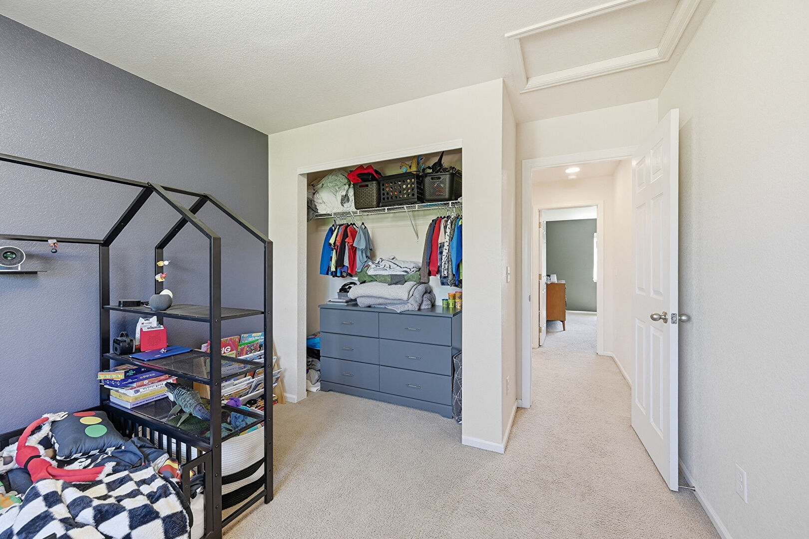 Carpet, Closet, Drywall, Natural Light, Scuttle, Textured Ceiling, Textured Wall, Baseboards Wall, Carpet
