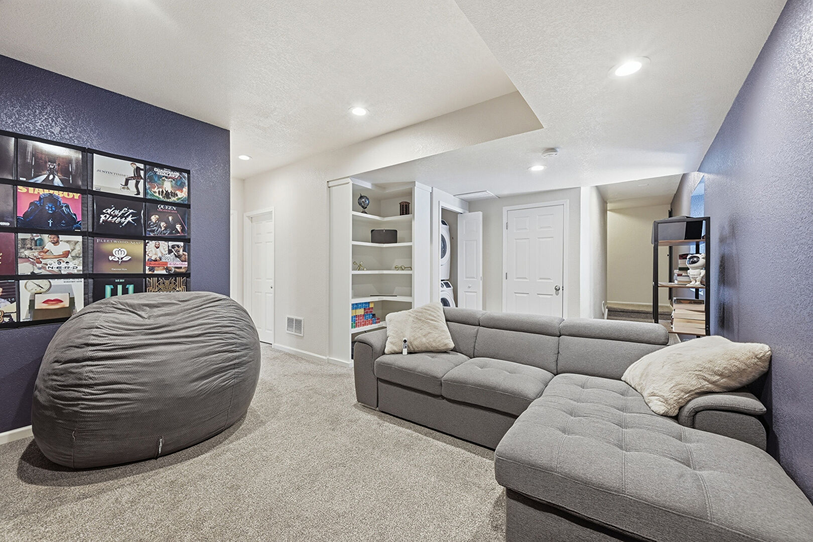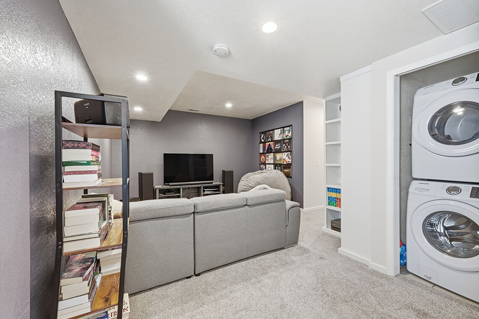 Baseboards Wall, Basement, Built In Shelves, Laundry, Recessed Lighting, Smoke Carbon Monoxide Detector, Textured Ceiling, Textured Wall, Vent, Carpet