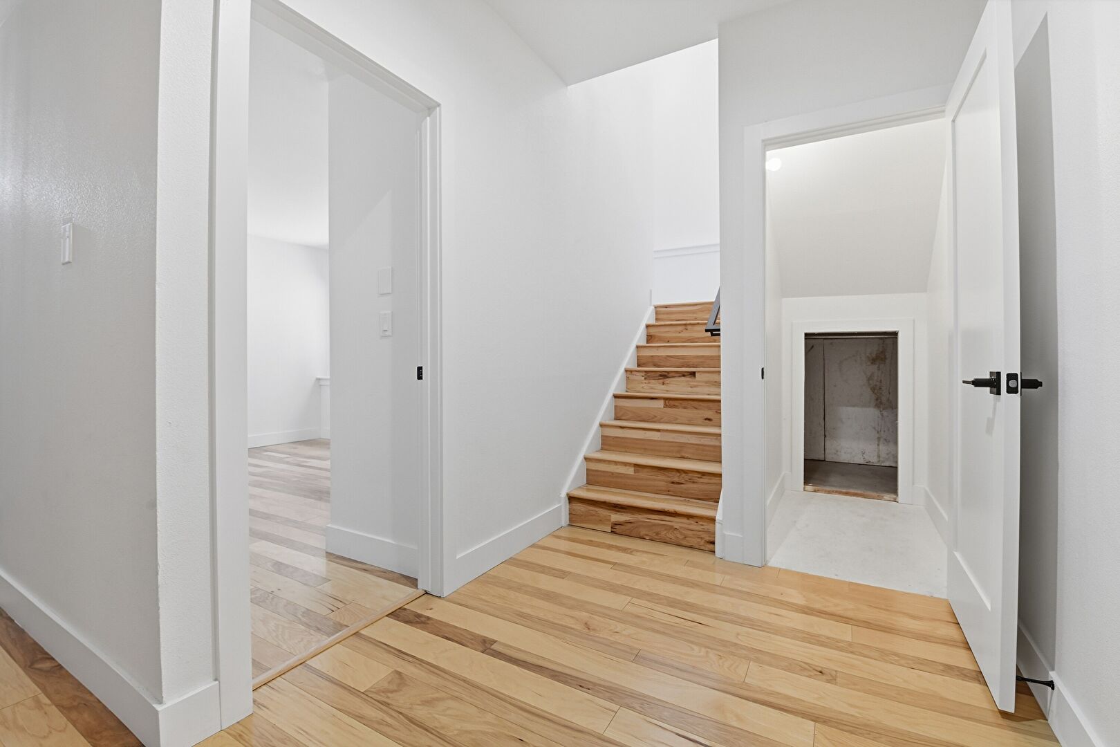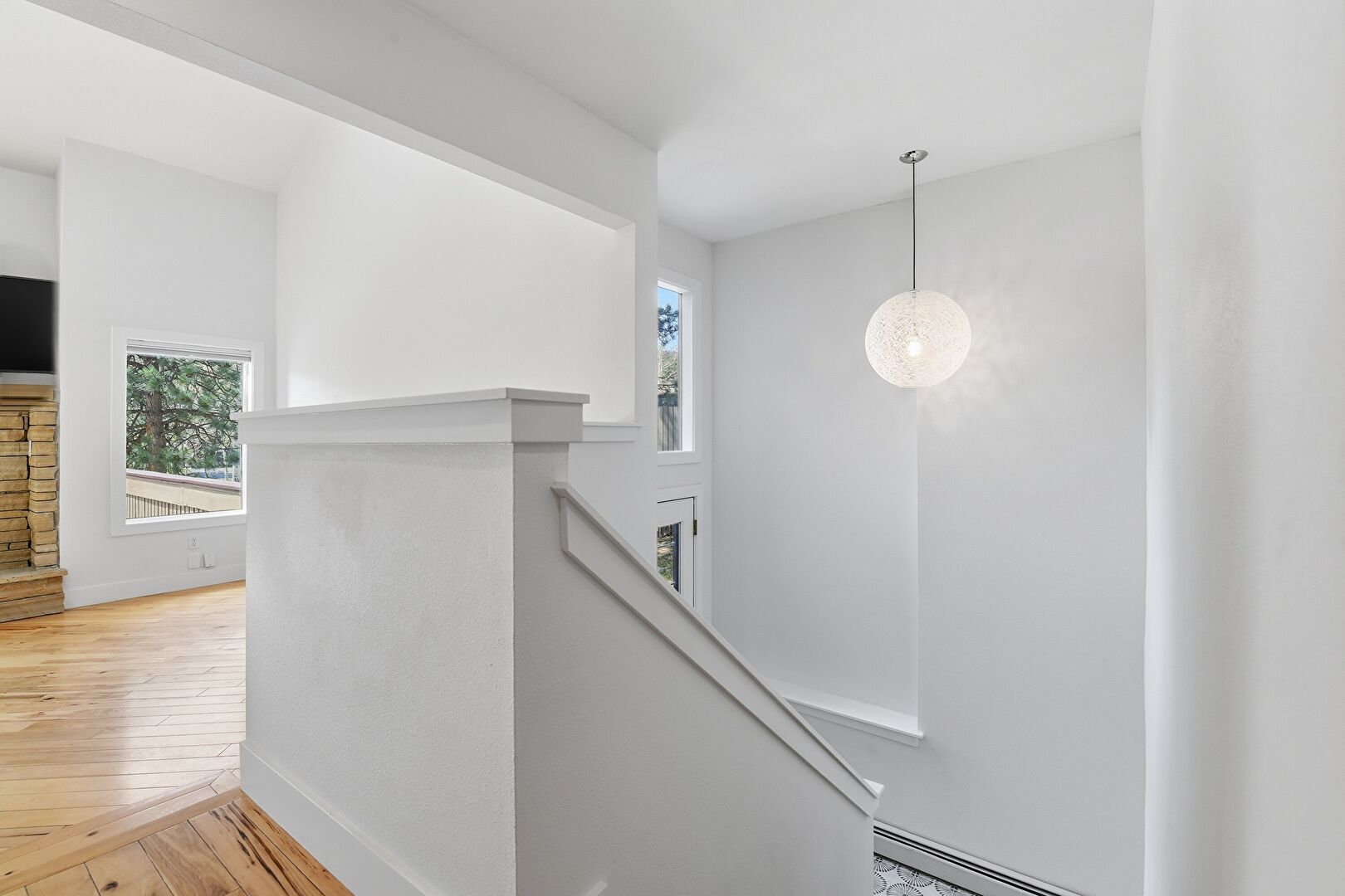 Baseboard Radiator, Baseboards Wall, Drywall, Natural Light, Upstairs Landing, Wood Finish Floor, Drywall, Stairs