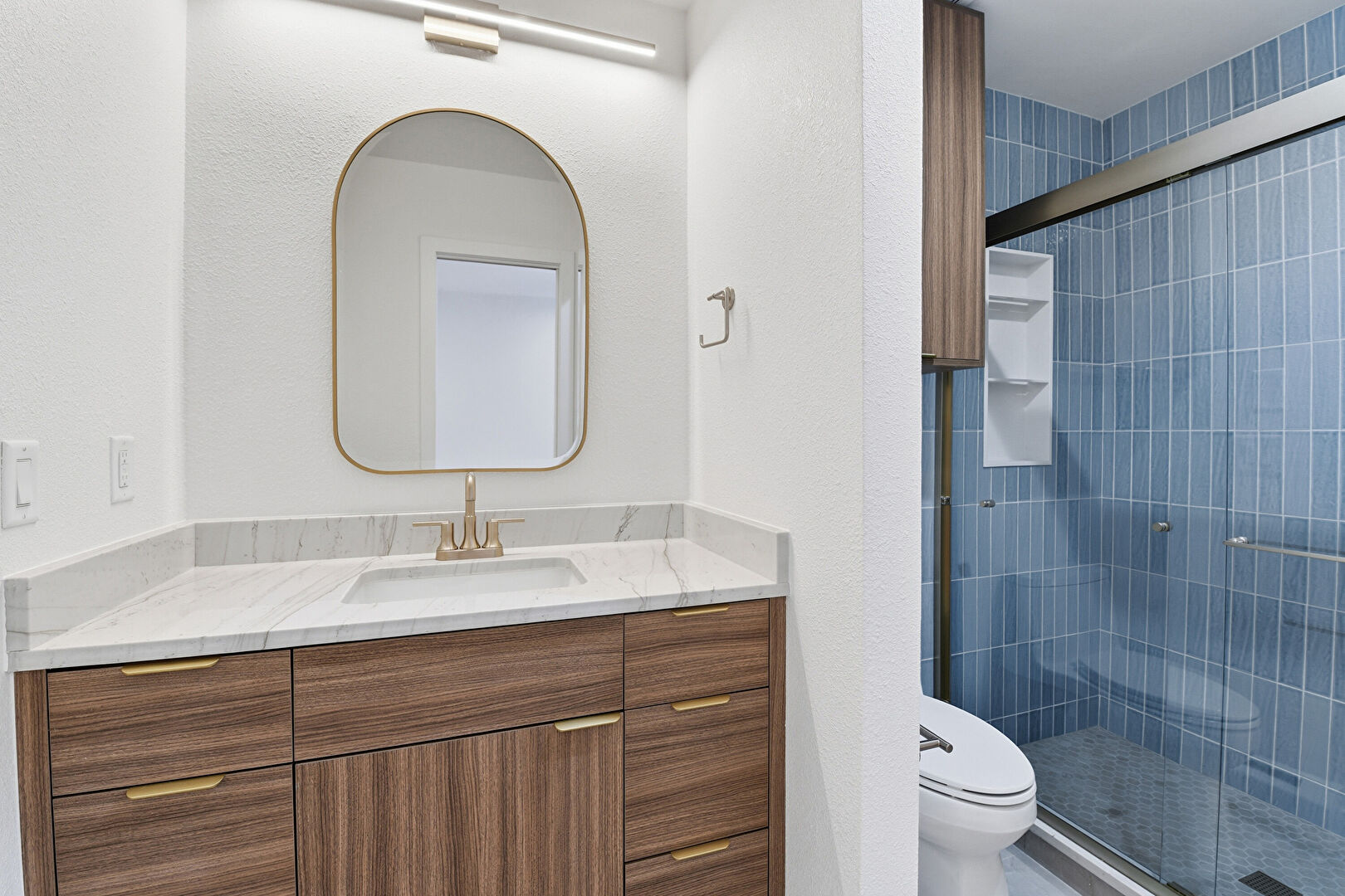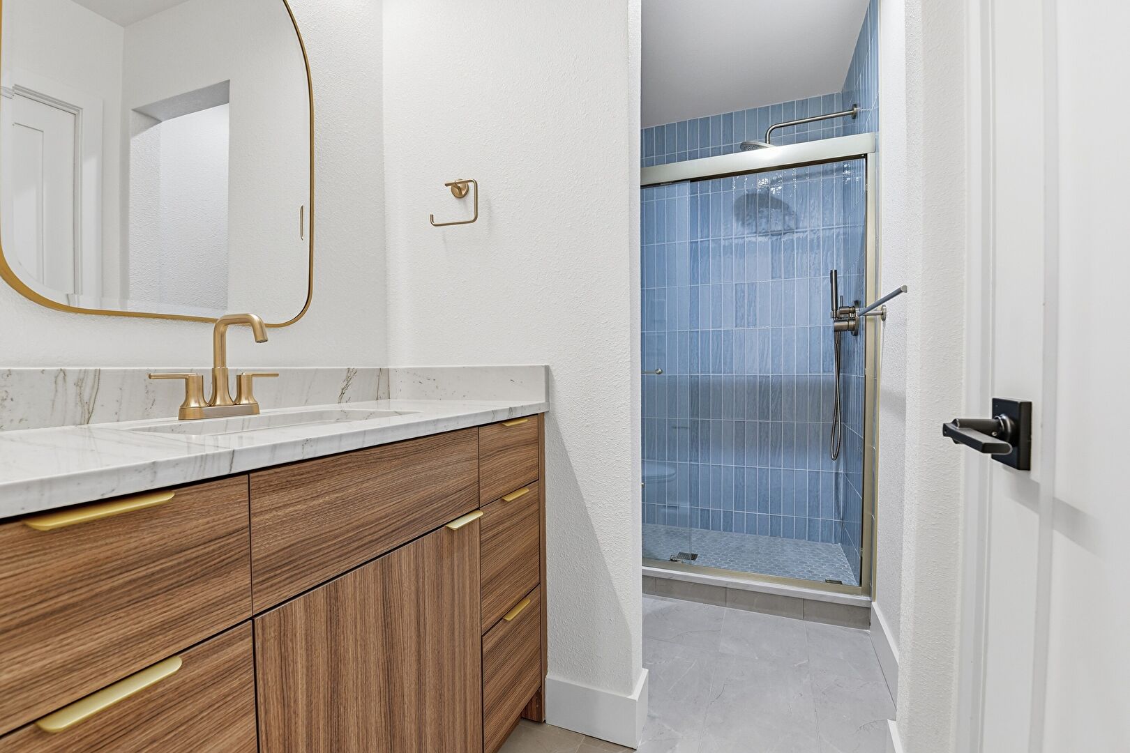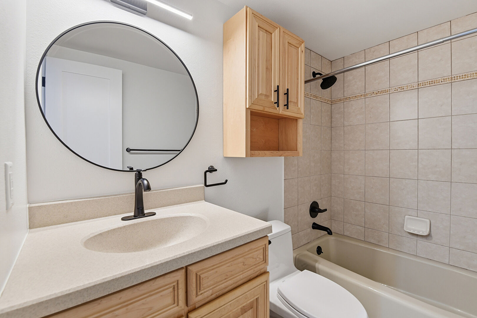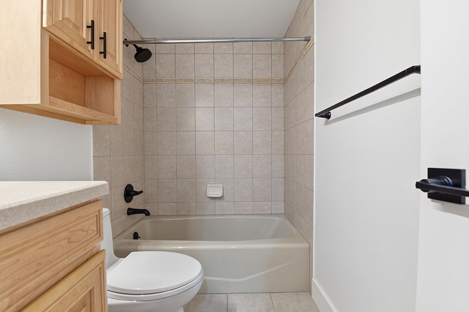 Baseboards Wall, Combined Bath Shower, Drywall, Full Bathroom, Vanity, Full Bathroom, Tile Floor