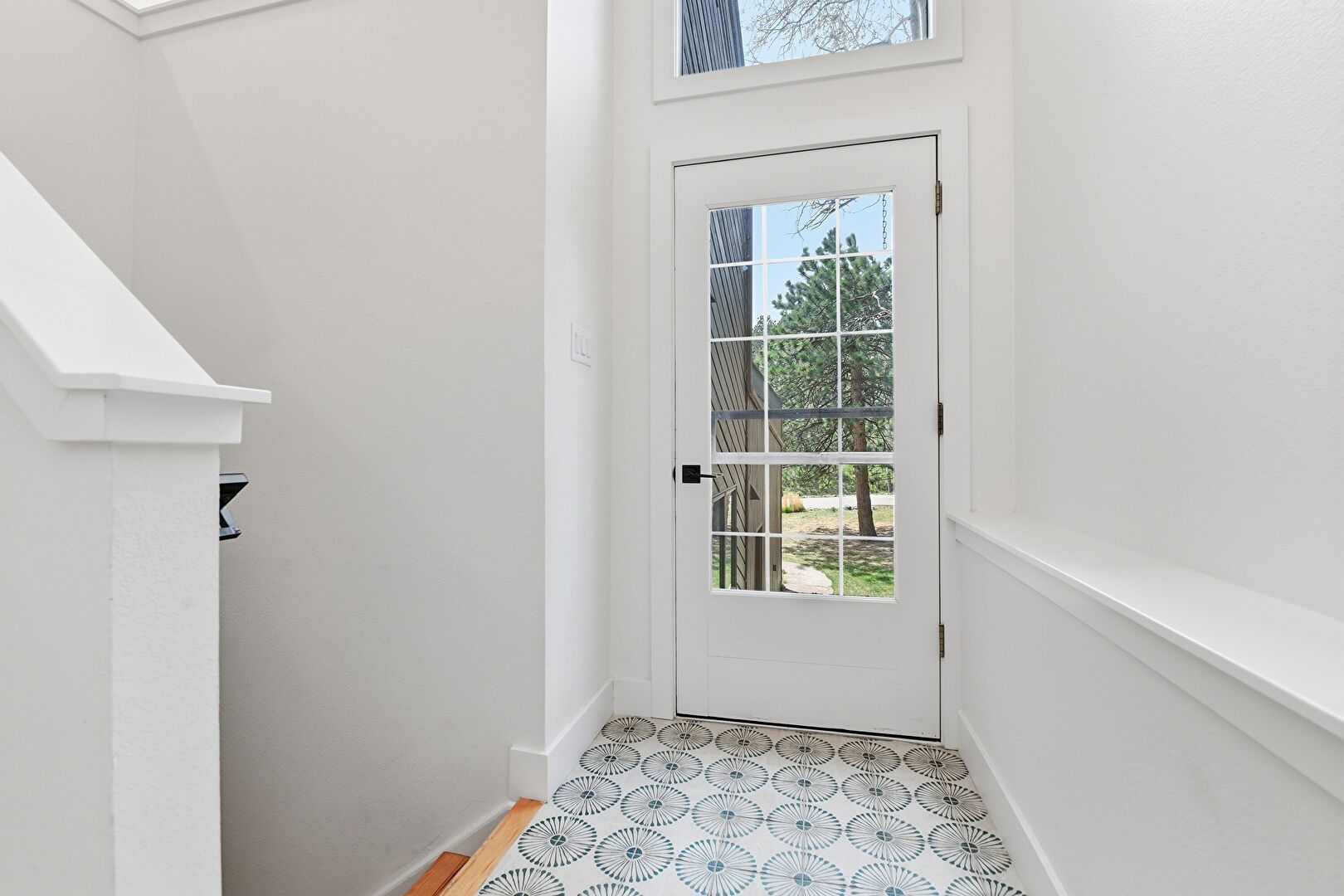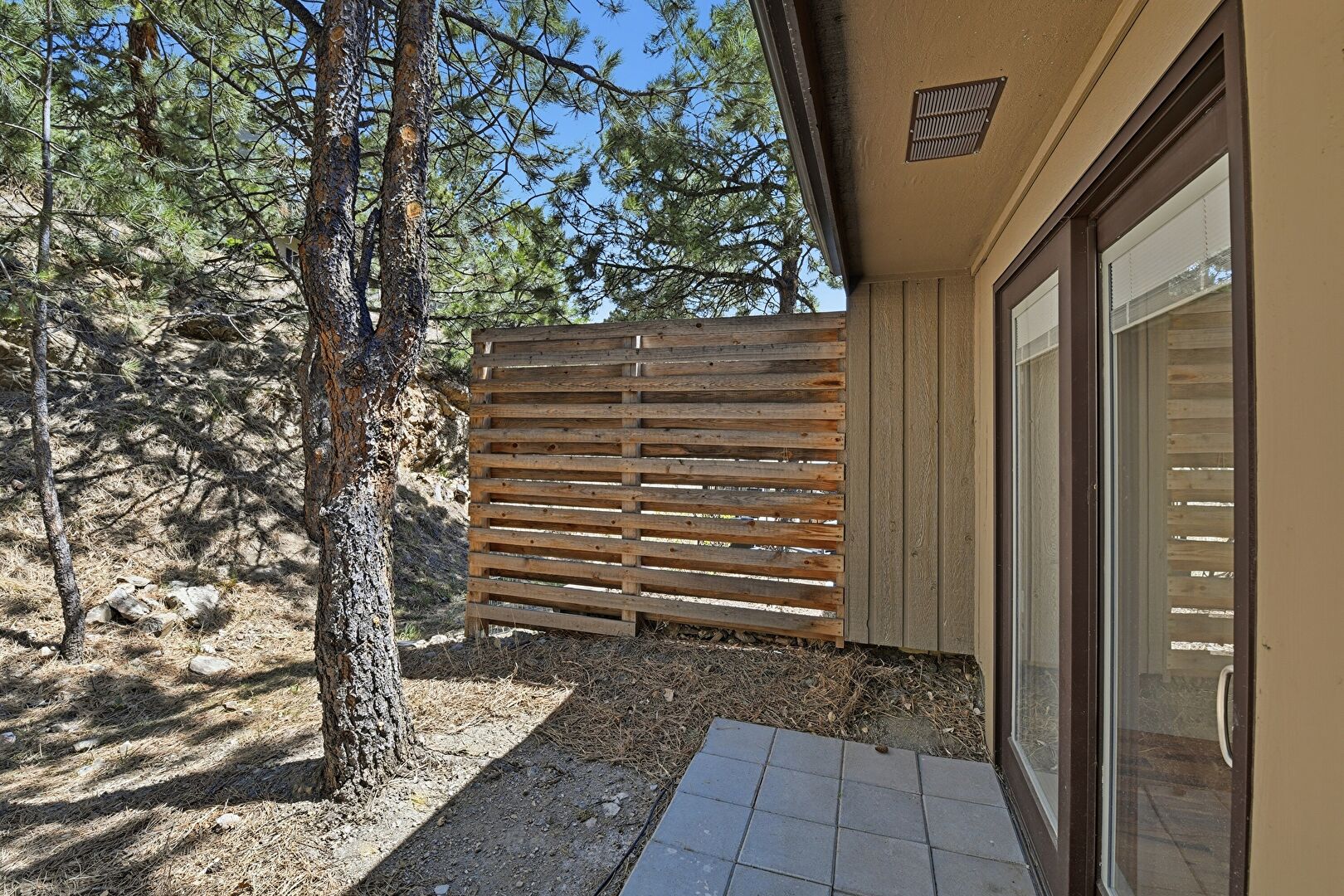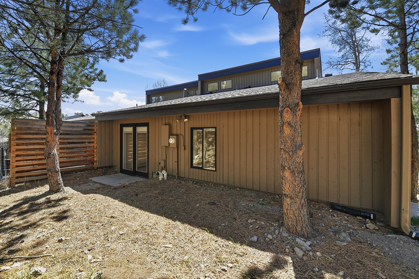 Electric Meter, Fence, Patio, Shingle Roof, Vertical Siding, French Doors
