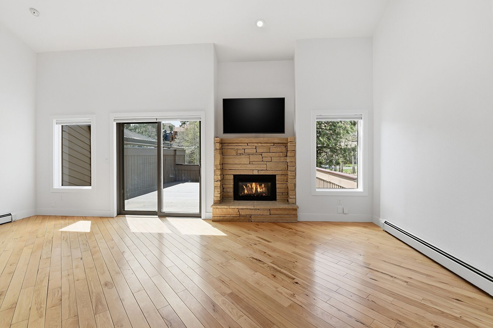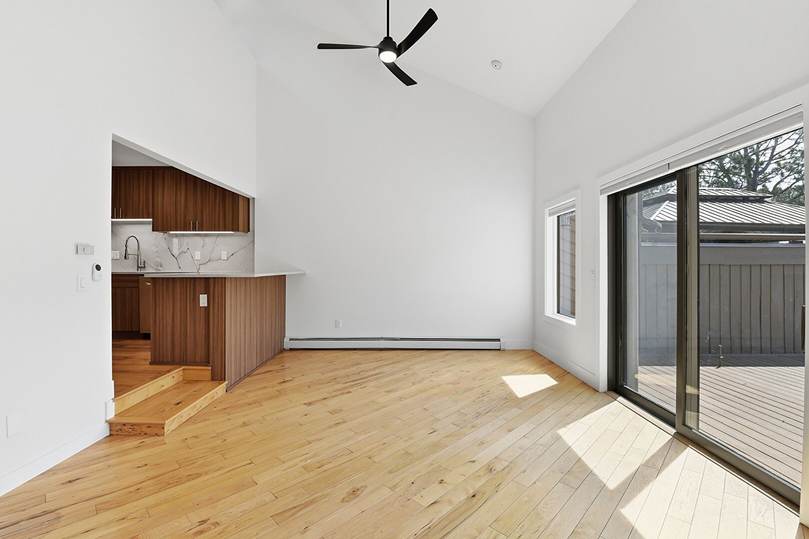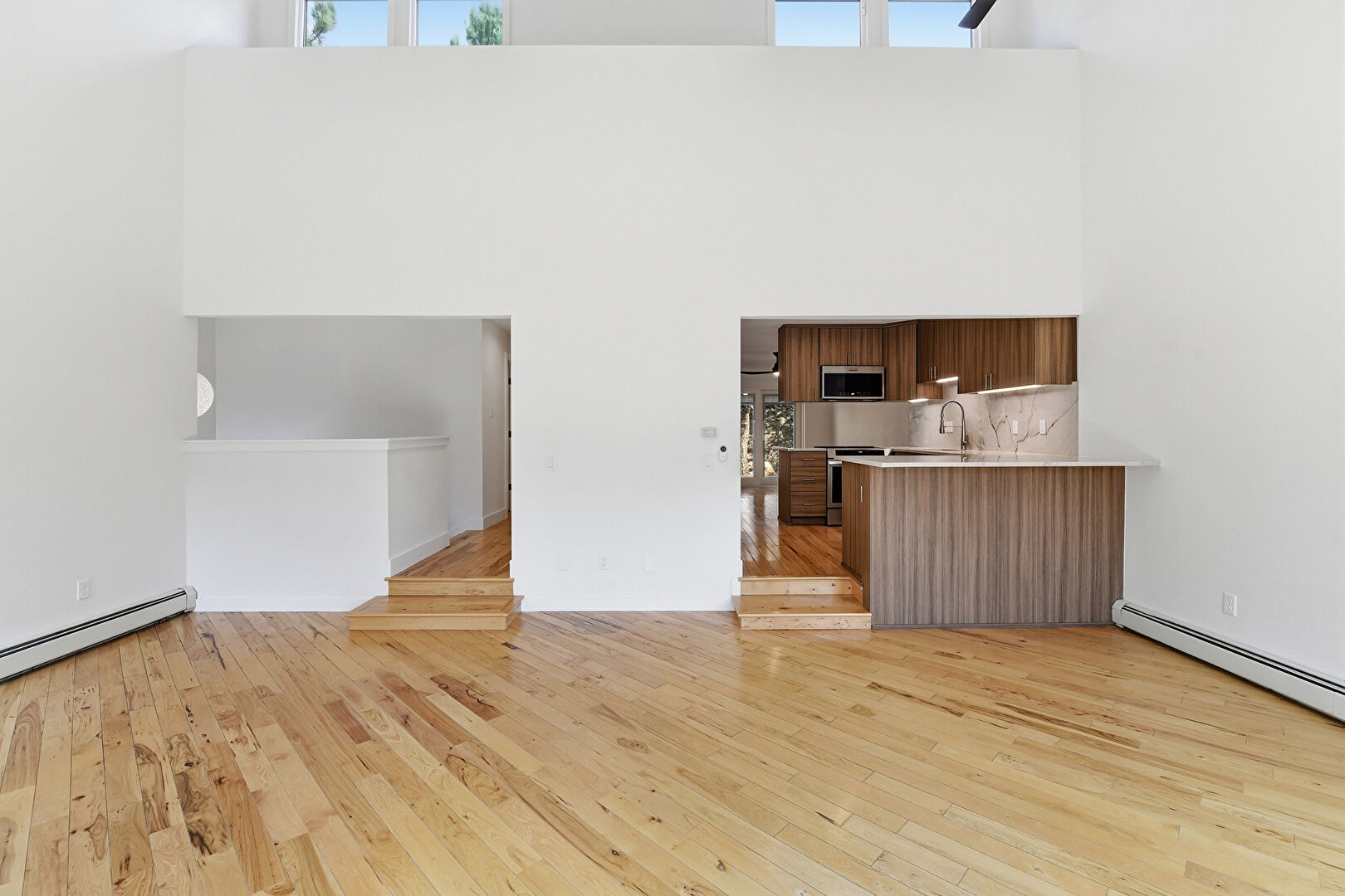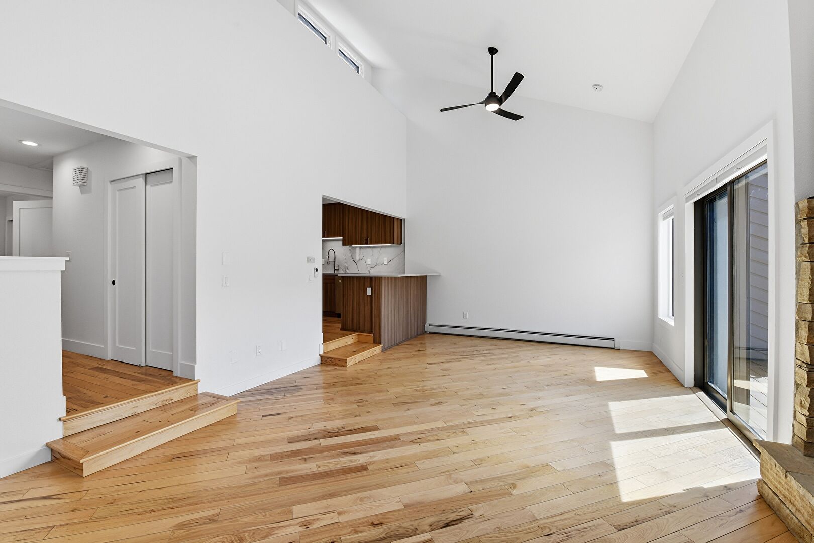 Baseboard Radiator, Baseboards Wall, Ceiling Fan, Drywall, Fireplace, Flat Panel Cabinets, High Ceiling, Kitchen Peninsula, Medium Brown Cabinets, Natural Light, Recessed Lighting, Vaulted Ceiling, Wood Finish Floor, Baseboard Radiator, Ceiling Fan, Drywall, Recessed Lighting, Wood Finish Floor