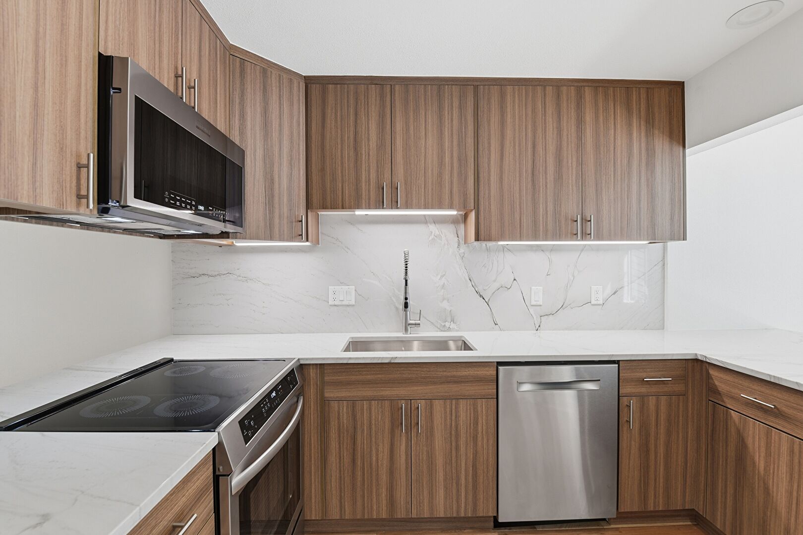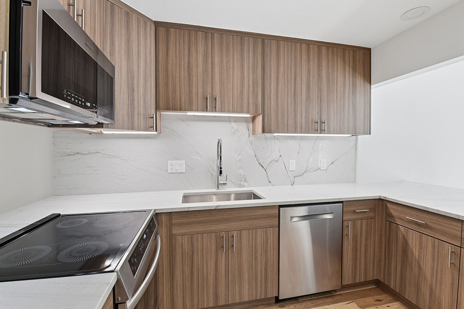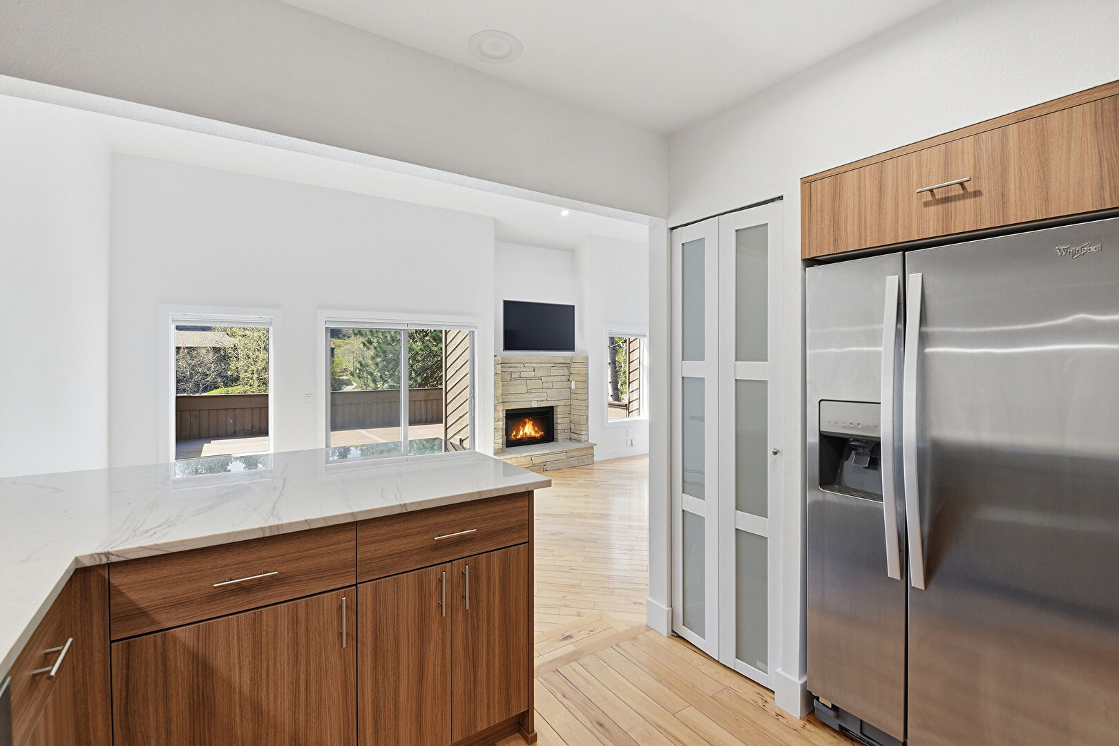 Baseboards Wall, Drywall, Fireplace, Flat Panel Cabinets, Kitchen Peninsula, Medium Brown Cabinets, Natural Light, Opens To Living Area, Recessed Lighting, Stone Countertops, Wood Finish Floor, Flat Panel Cabinets, Medium Brown Cabinets, Wood Finish Floor