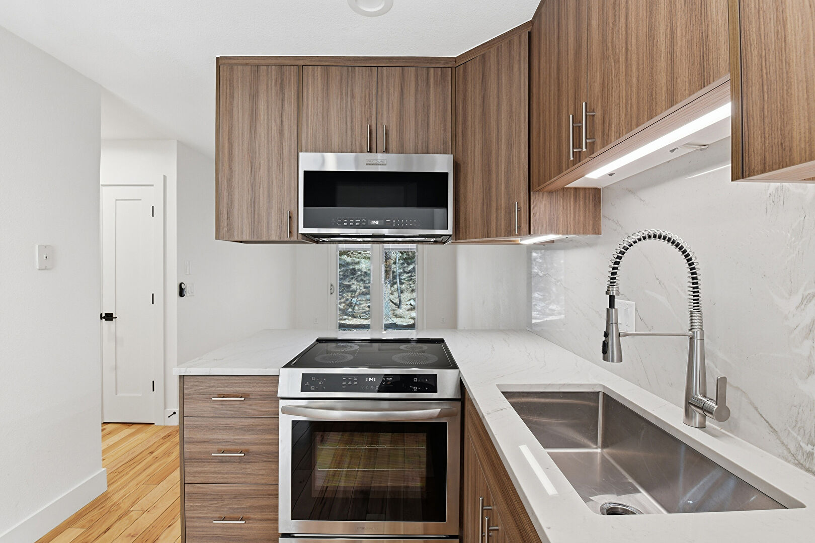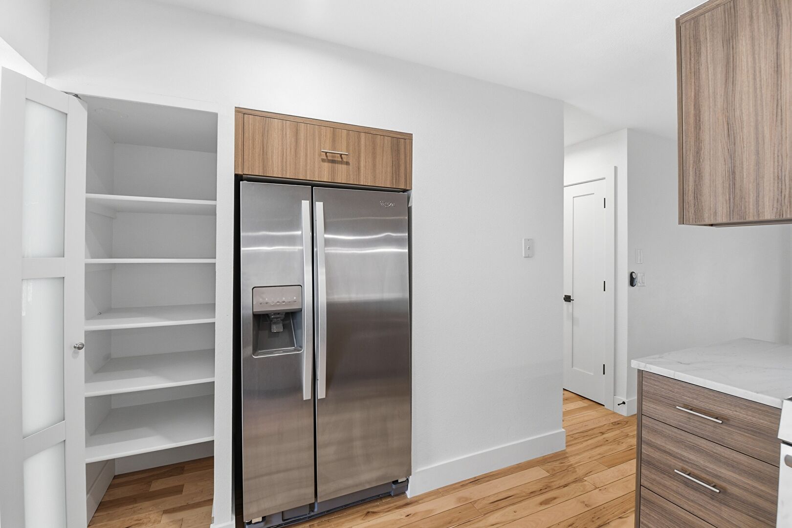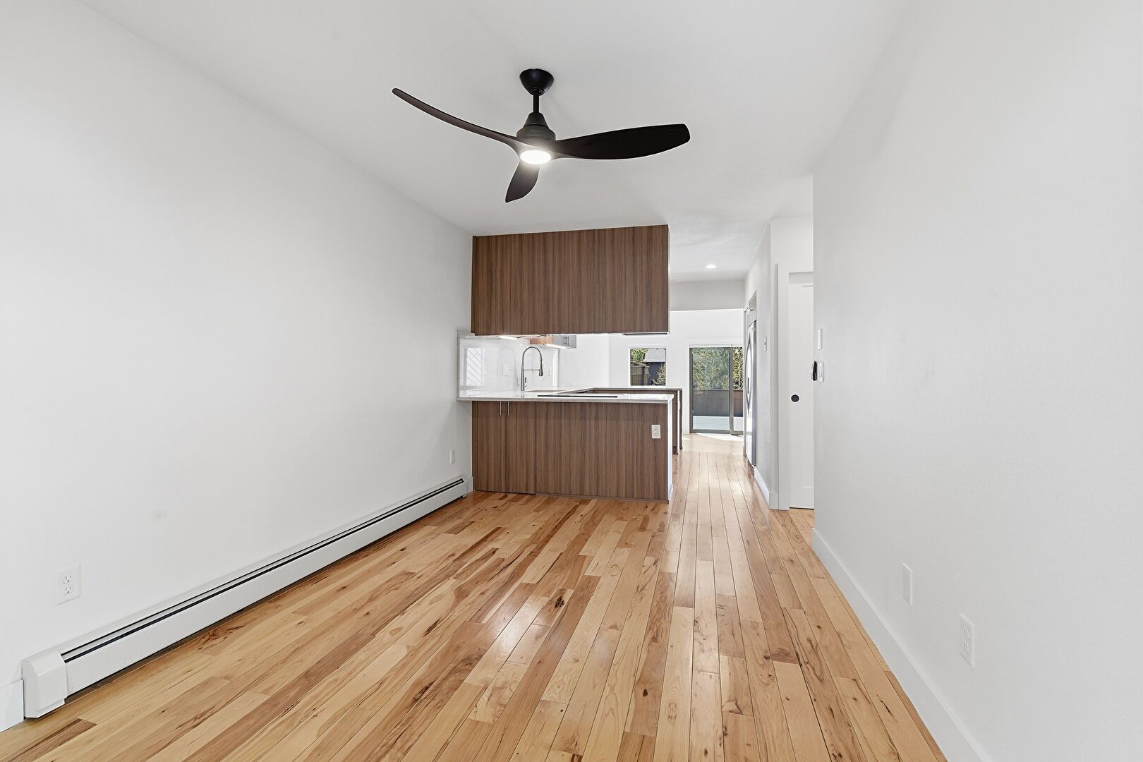 Baseboard Radiator, Baseboards Wall, Ceiling Fan, Drywall, Flat Panel Cabinets, Medium Brown Cabinets, Natural Light, Recessed Lighting, Wood Finish Floor, Kitchen Peninsula, Natural Light