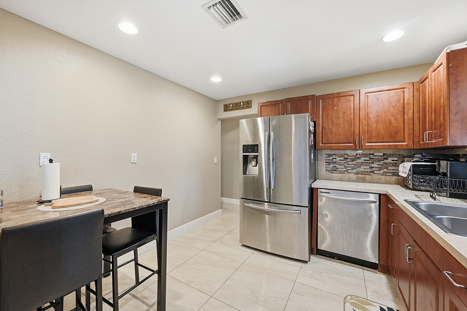 Baseboards Wall, Medium Brown Cabinets, Natural Light, Raised Cabinets, Recessed Lighting, Textured Wall, Tile Floor, Toaster, Vent, Textured Wall, Vent