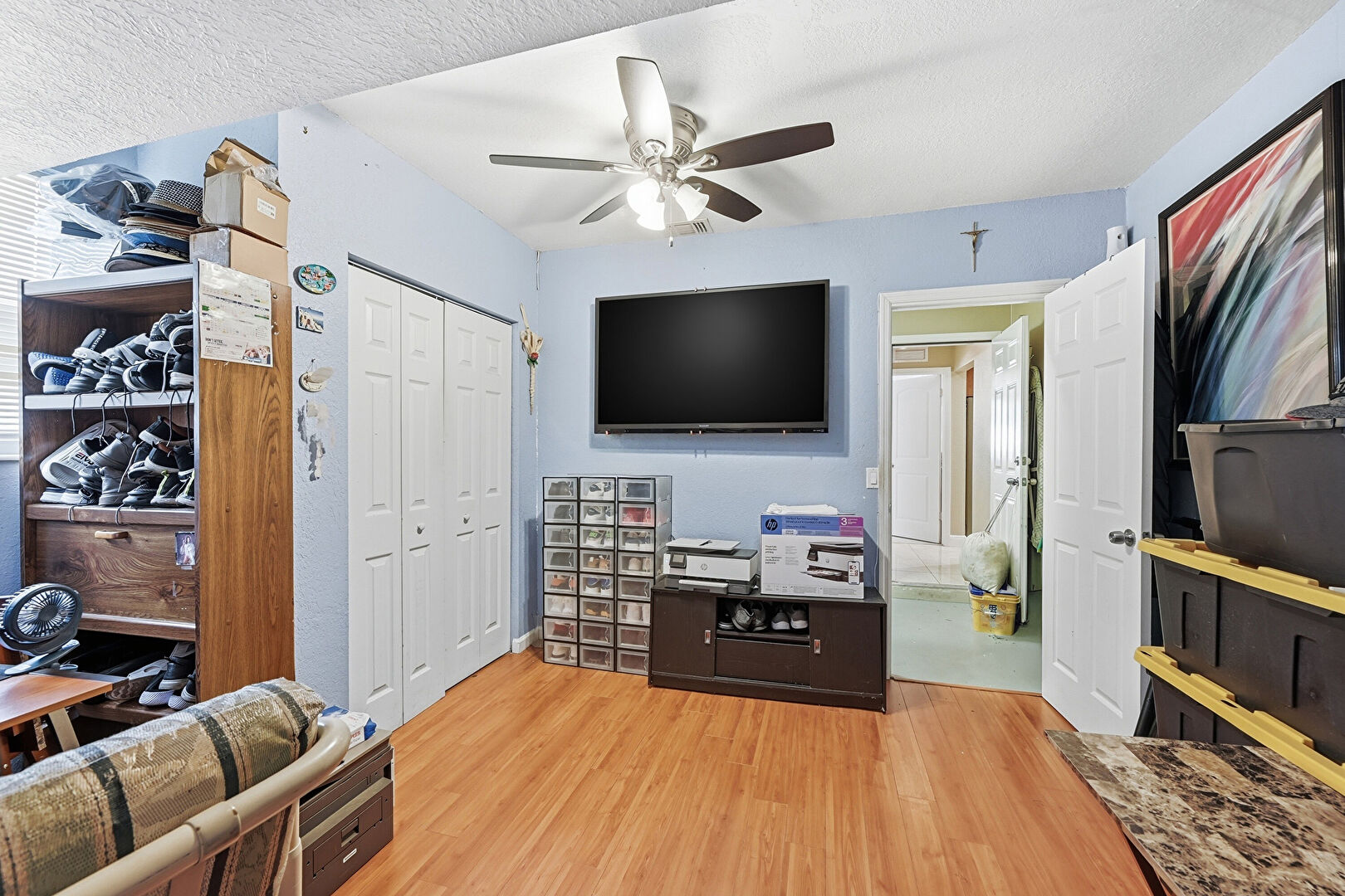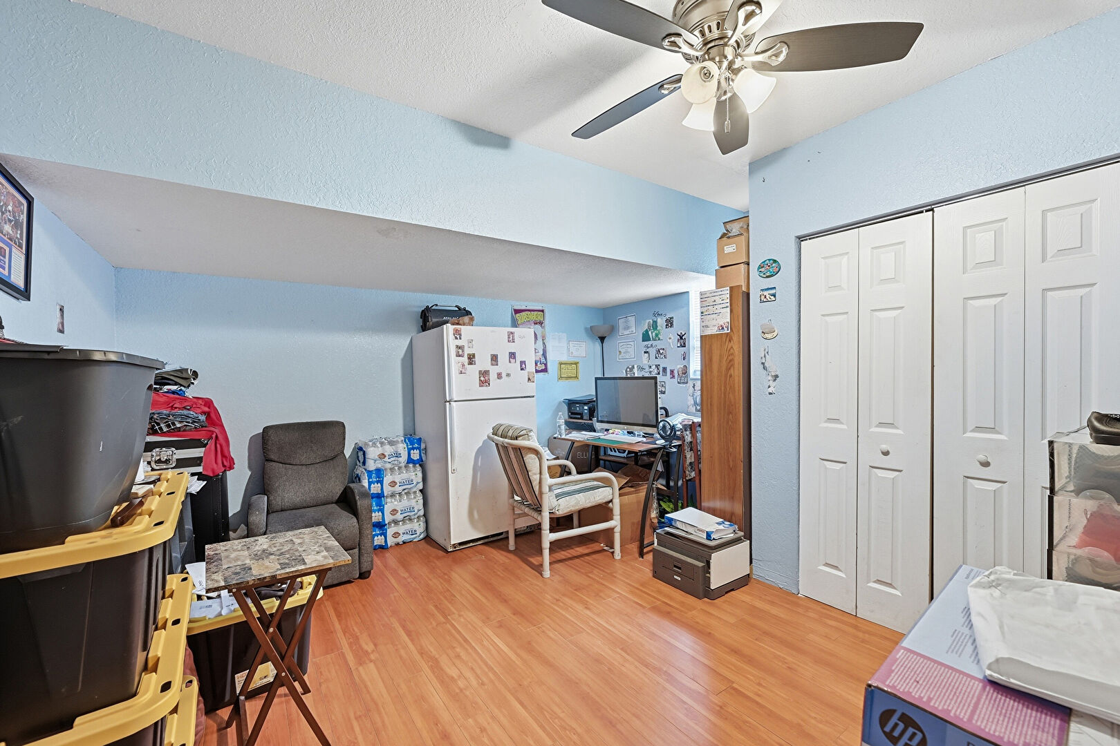Ceiling Fan, Drywall, Office Area, Textured Ceiling, Wood Finish Floor