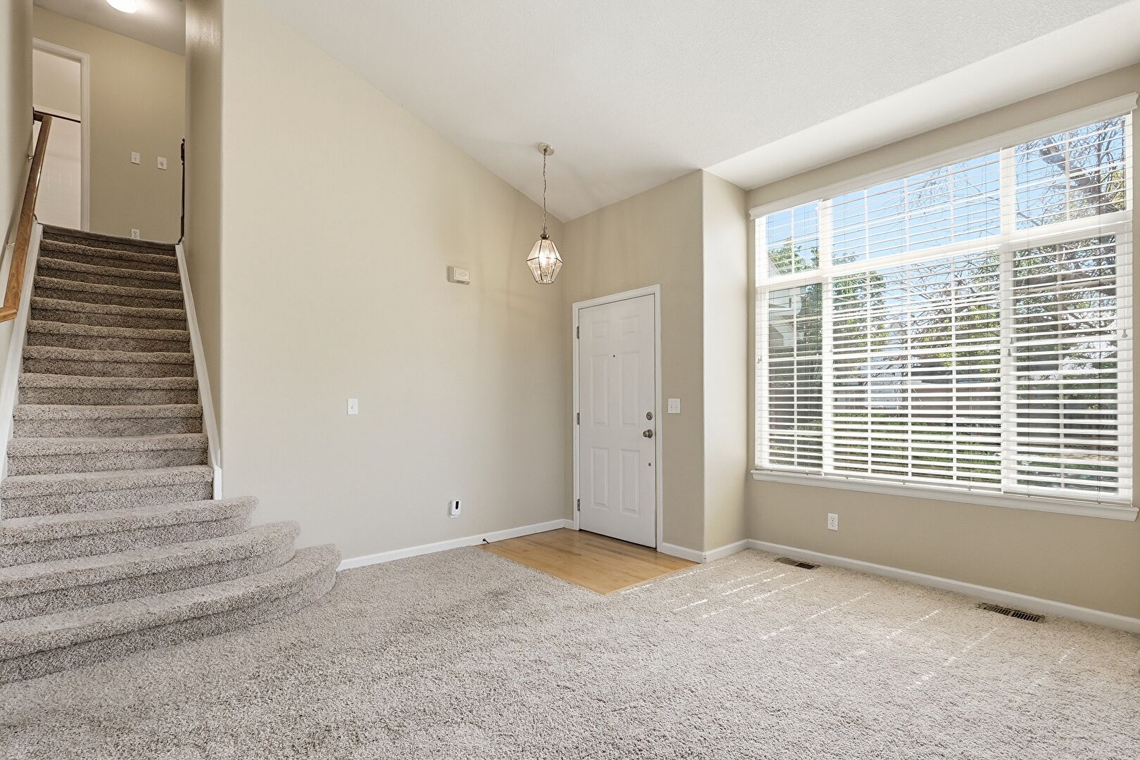 Baseboards Wall, Carpet, Drywall, Natural Light, Notable Chandelier, Stairs, Vaulted Ceiling, Vent, Drywall, High Ceiling