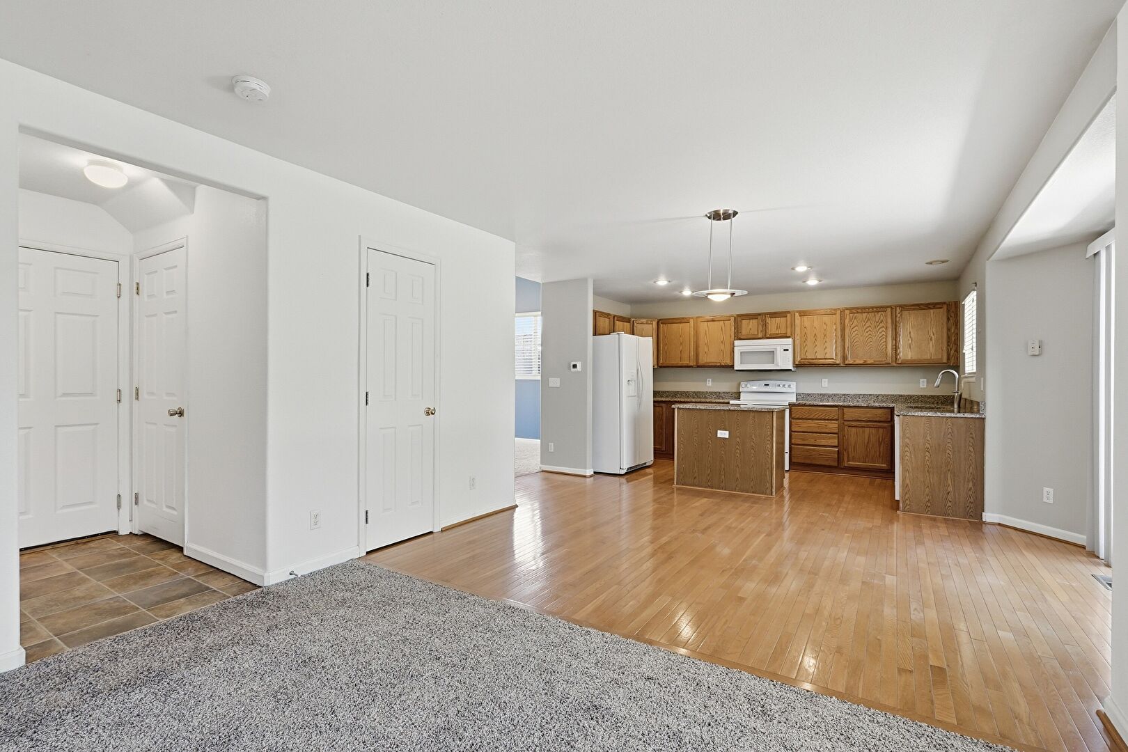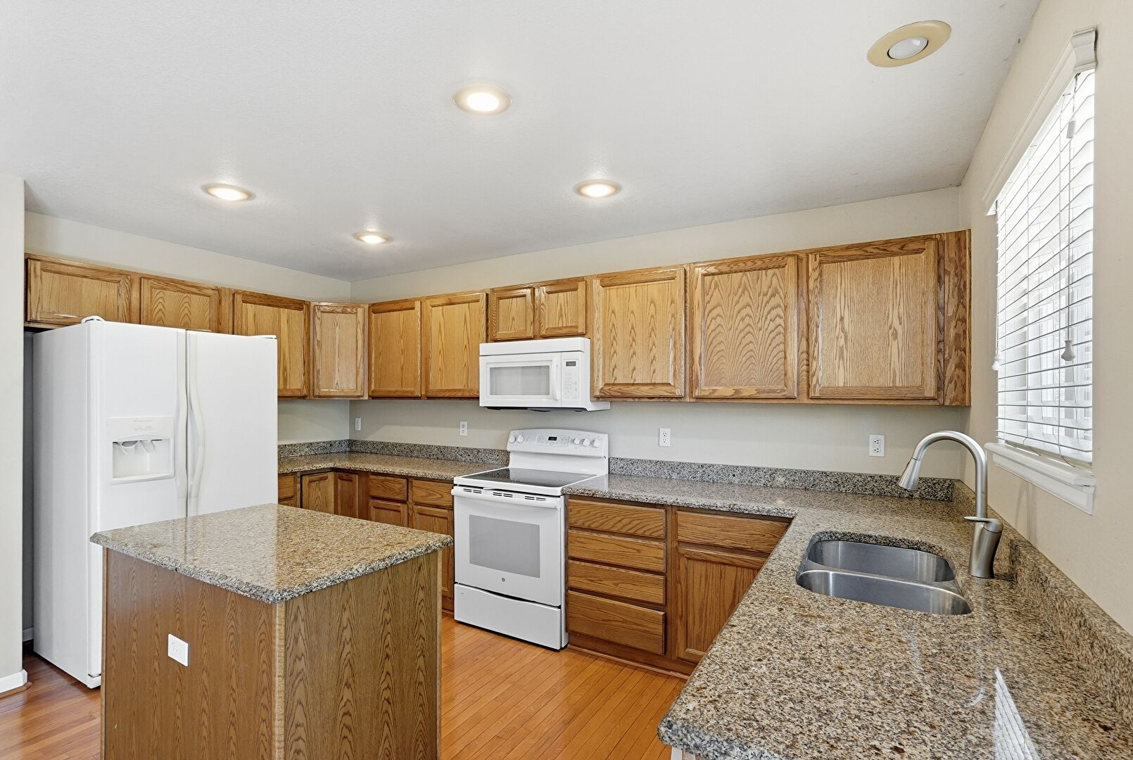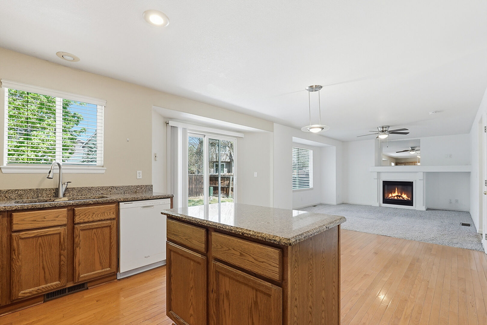 Baseboards Wall, Carpet, Ceiling Fan, Drywall, Fireplace, Kitchen Island, Medium Brown Cabinets, Natural Light, Opens To Living Area, Pendant Lighting, Recessed Lighting, Shaker Cabinets, Smoke Carbon Monoxide Detector, Stone Countertops, U Shaped Kitchen, Vent, Wood Finish Floor, Baseboards Wall, Carpet
