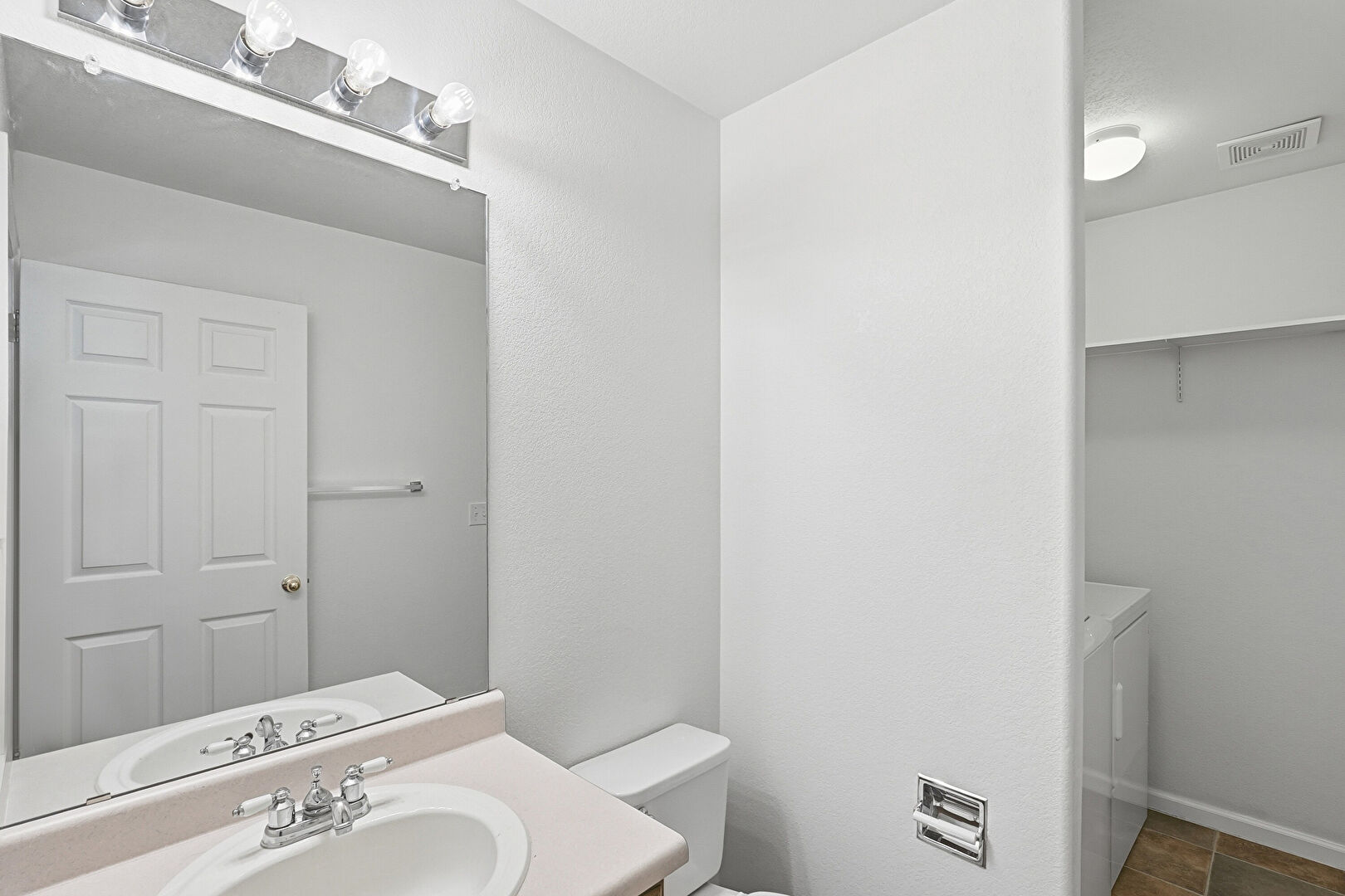 Baseboards Wall, Half Bathroom, Stone Finish Floor, Textured Wall, Vanity, Vent, Walk In Closet, Washer Dryer, Laundry