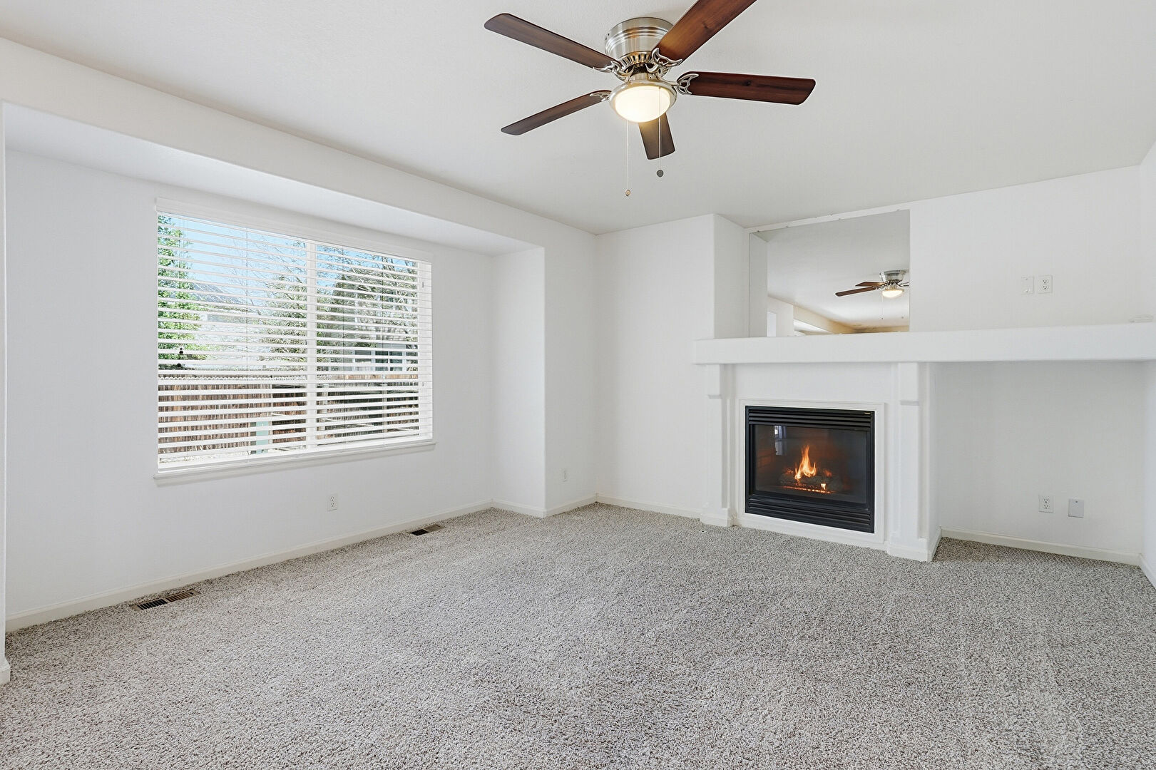 Baseboards Wall, Carpet, Ceiling Fan, Fireplace, Natural Light, Smoke Carbon Monoxide Detector, Vent, Wood Finish Floor, Drywall