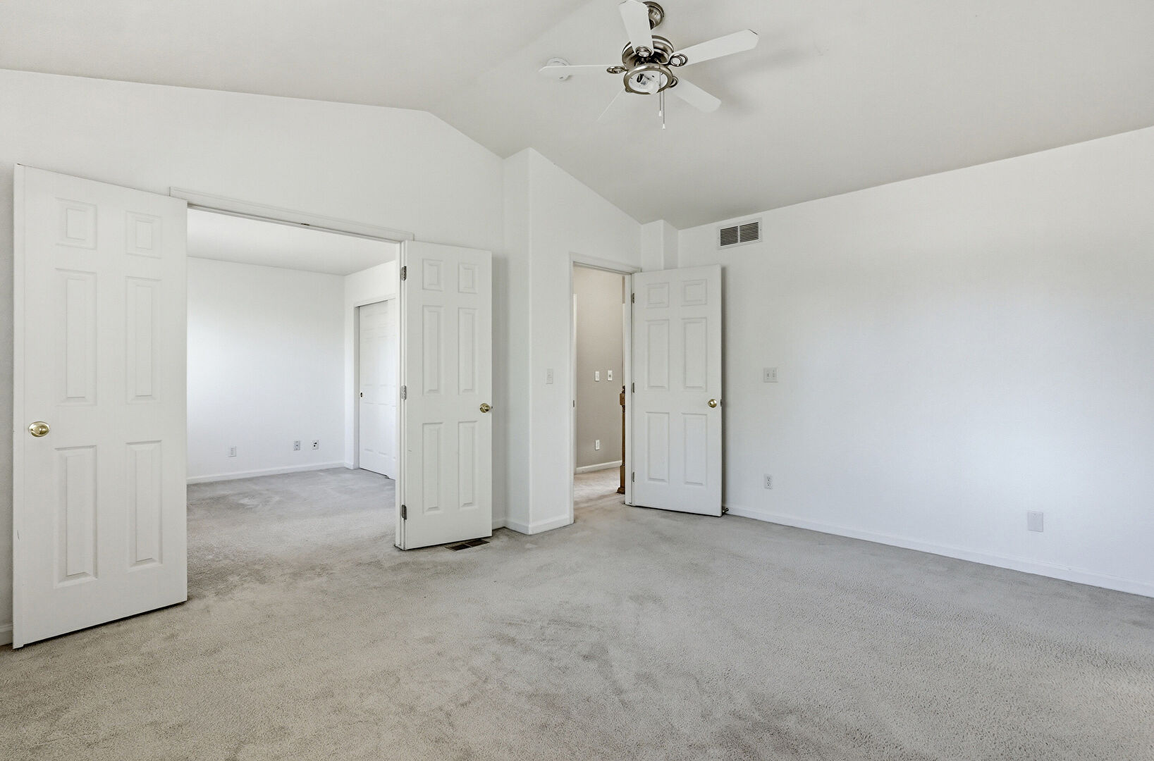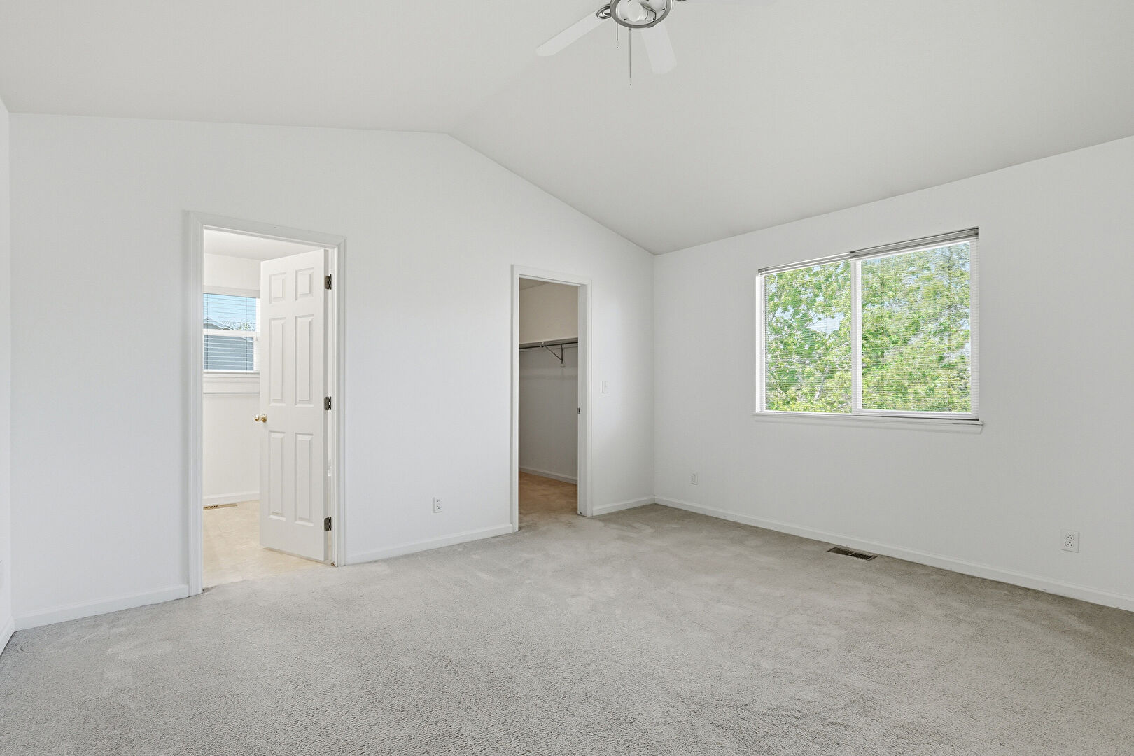 Baseboards Wall, Carpet, Cathedral Ceiling, Ceiling Fan, Drywall, Ensuite Bathroom, High Ceiling, Vaulted Ceiling, Vent, Walk In Closet, Baseboards Wall, Natural Light
