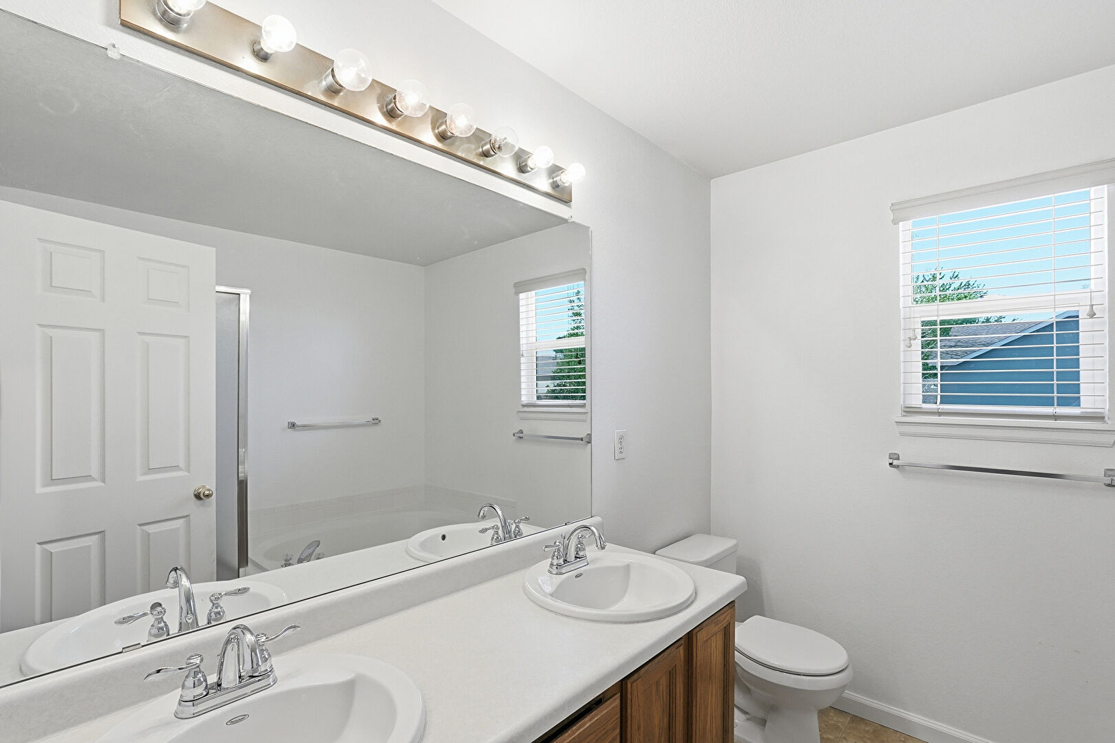 Baseboards Wall, Double Vanity, Full Bathroom, Natural Light, Tile Floor, Drywall