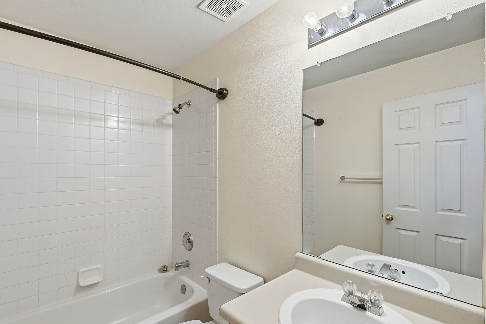 Full Bathroom, Textured Wall, Vanity, Vent, Combined Bath Shower