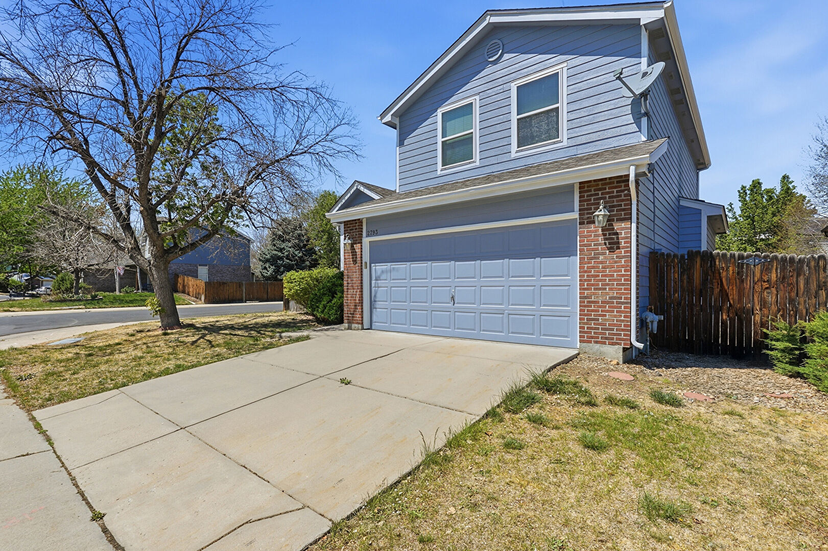 Brick Siding, Built In Garage, Concrete Foundation, Downspout, Driveway, Fence, Gas Meter, Gutters, Horizontal Siding, Lawn, Satellite Dish, Shingle Roof, Built In Garage, Downspout, Fence