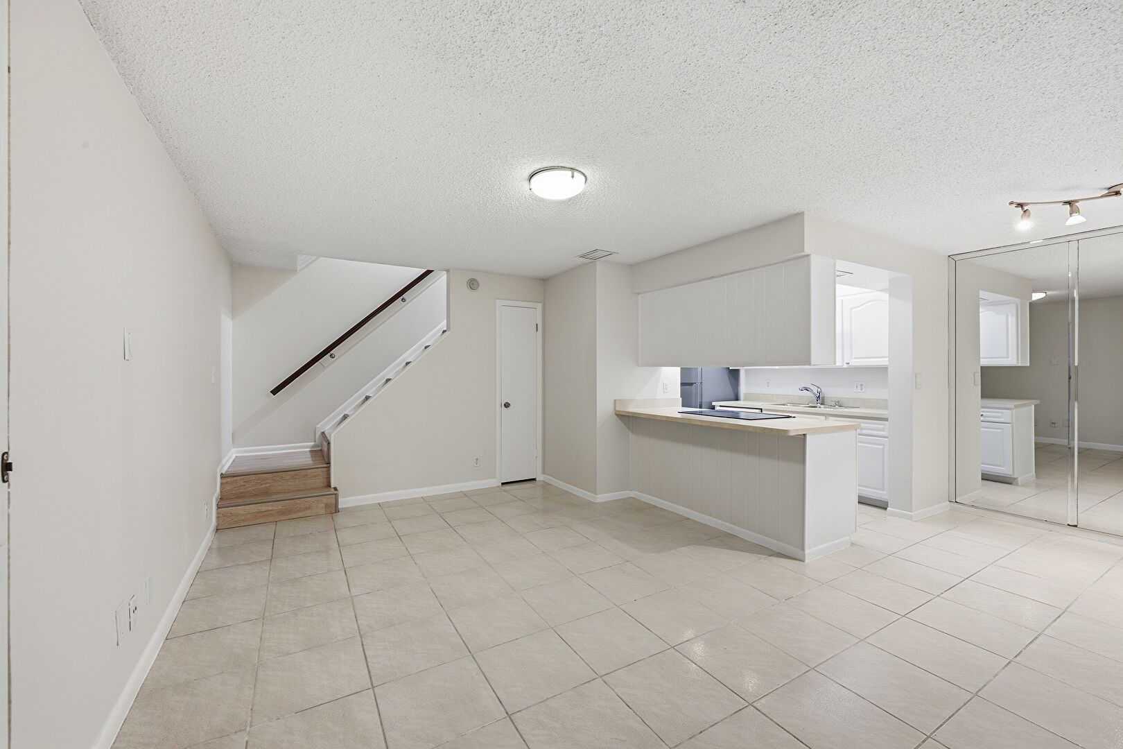 Baseboards Wall, Drywall, Kitchen Peninsula, Natural Light, Opens To Living Area, Pendant Lighting, Raised Cabinets, Stairs, Textured Ceiling, Tile Floor, Vent, Drywall, Kitchen Peninsula, Raised Cabinets, Textured Ceiling
