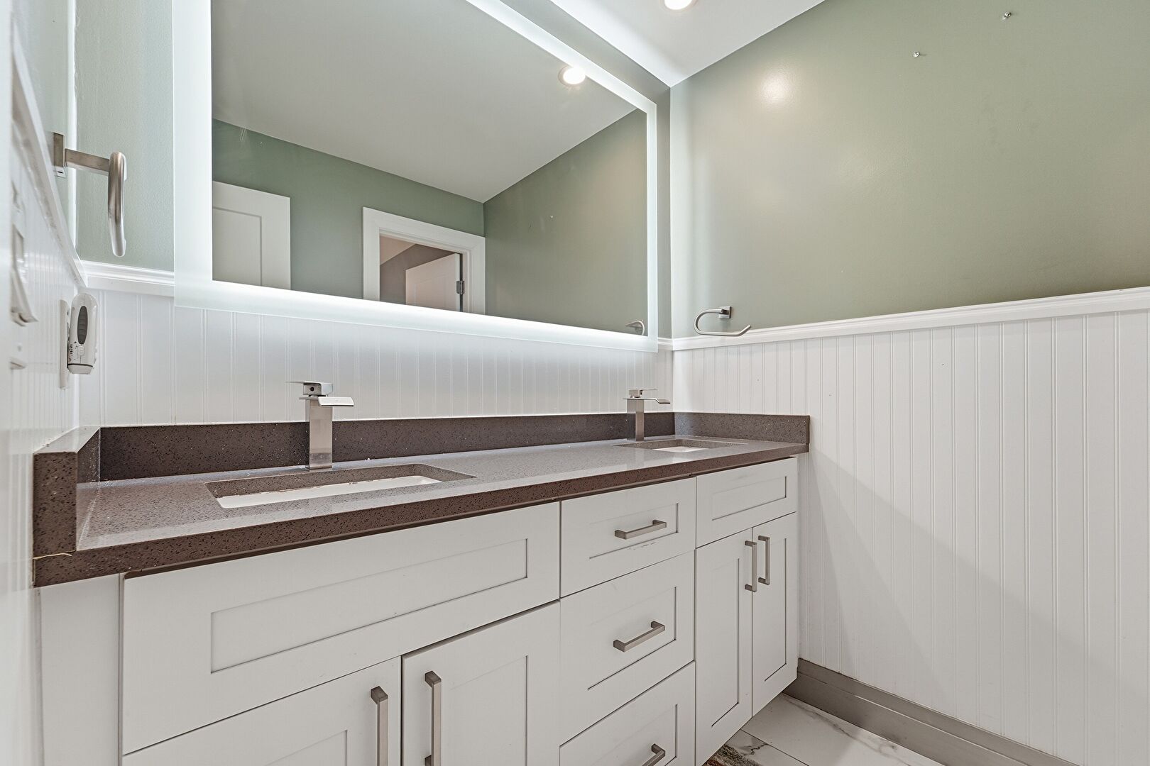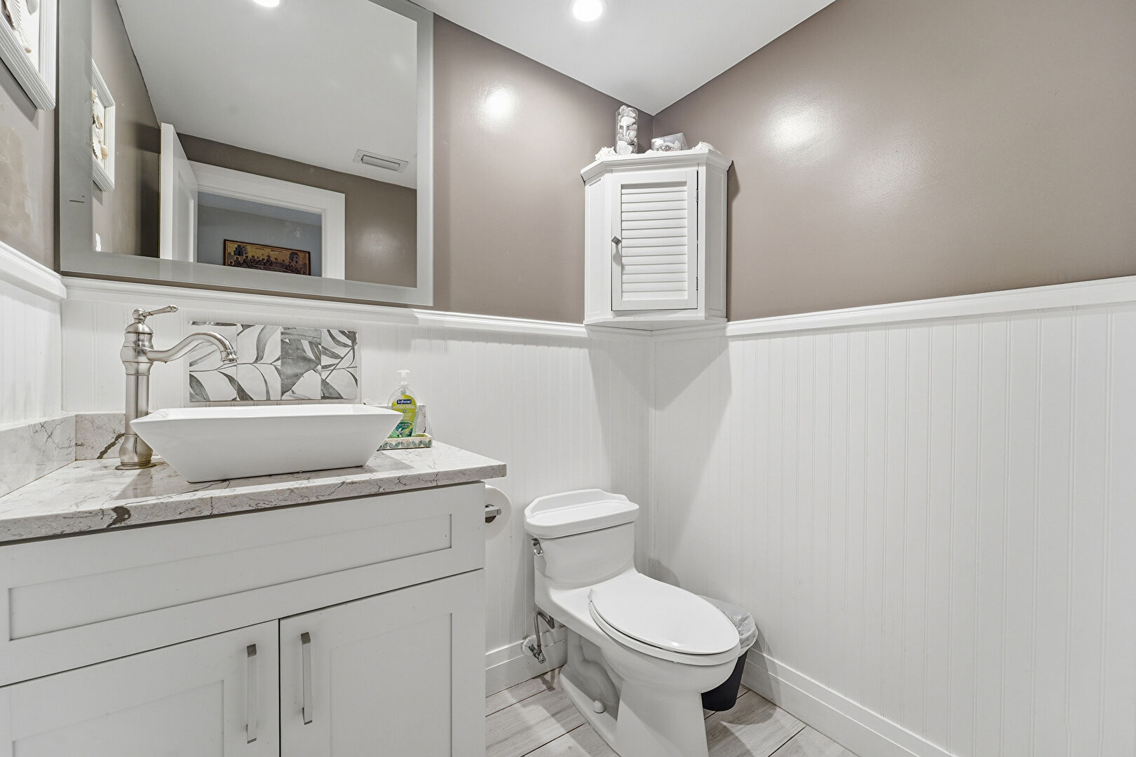 Baseboards Wall, Drywall, Half Bathroom, Vanity, Vent, Wainscot Wall, Recessed Lighting