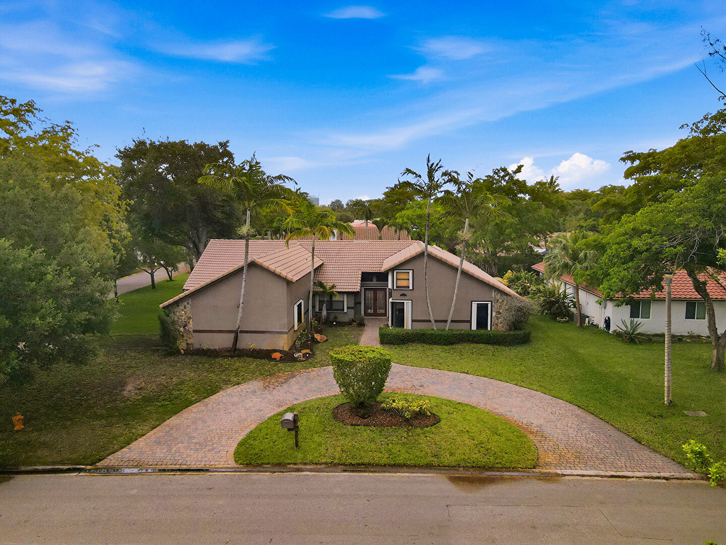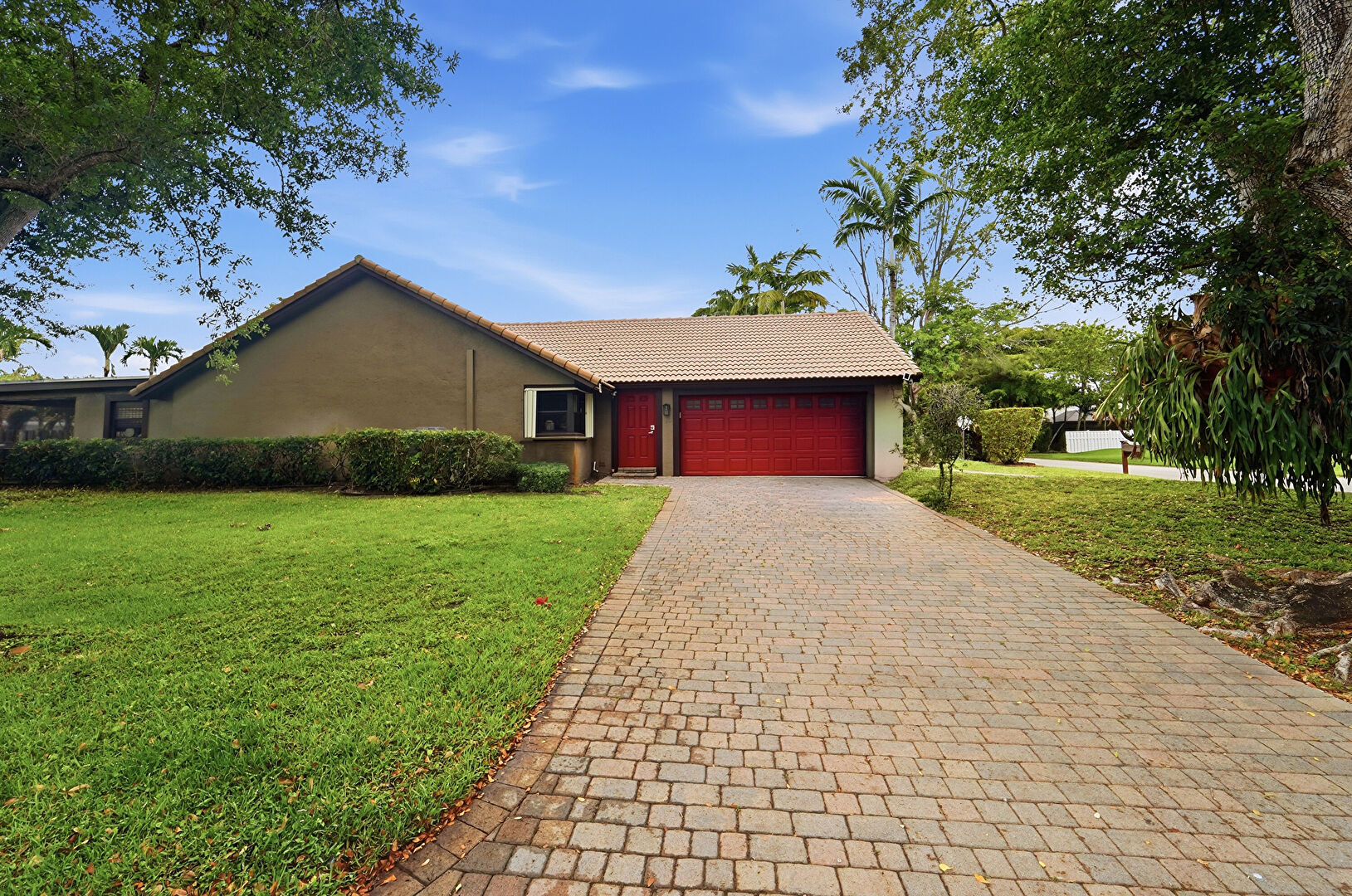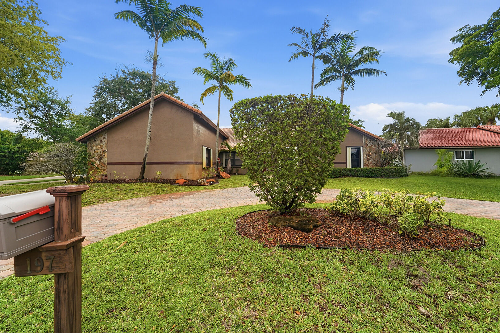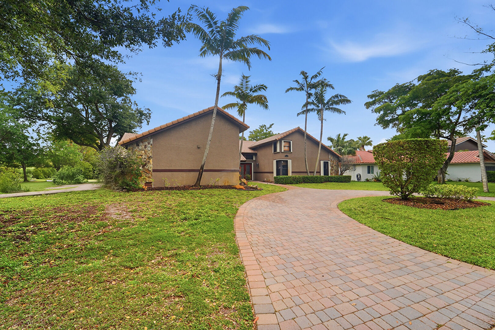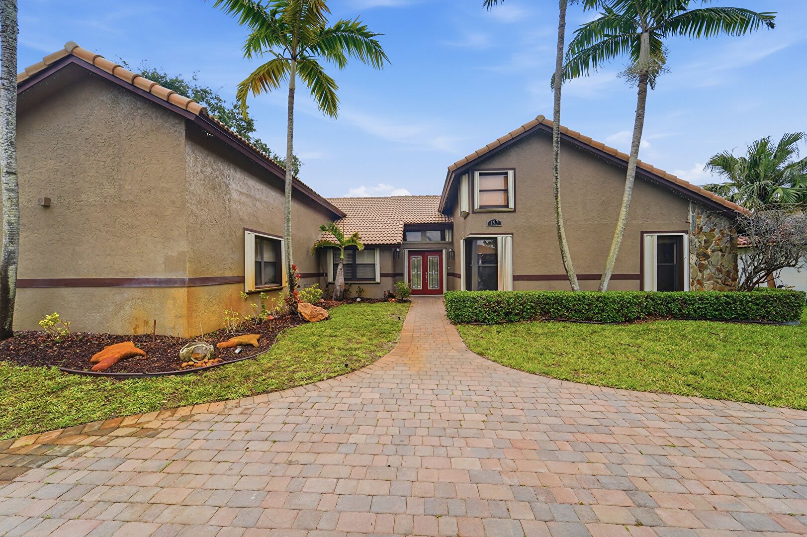 Lawn, Stucco Siding, Tile Roof, Driveway