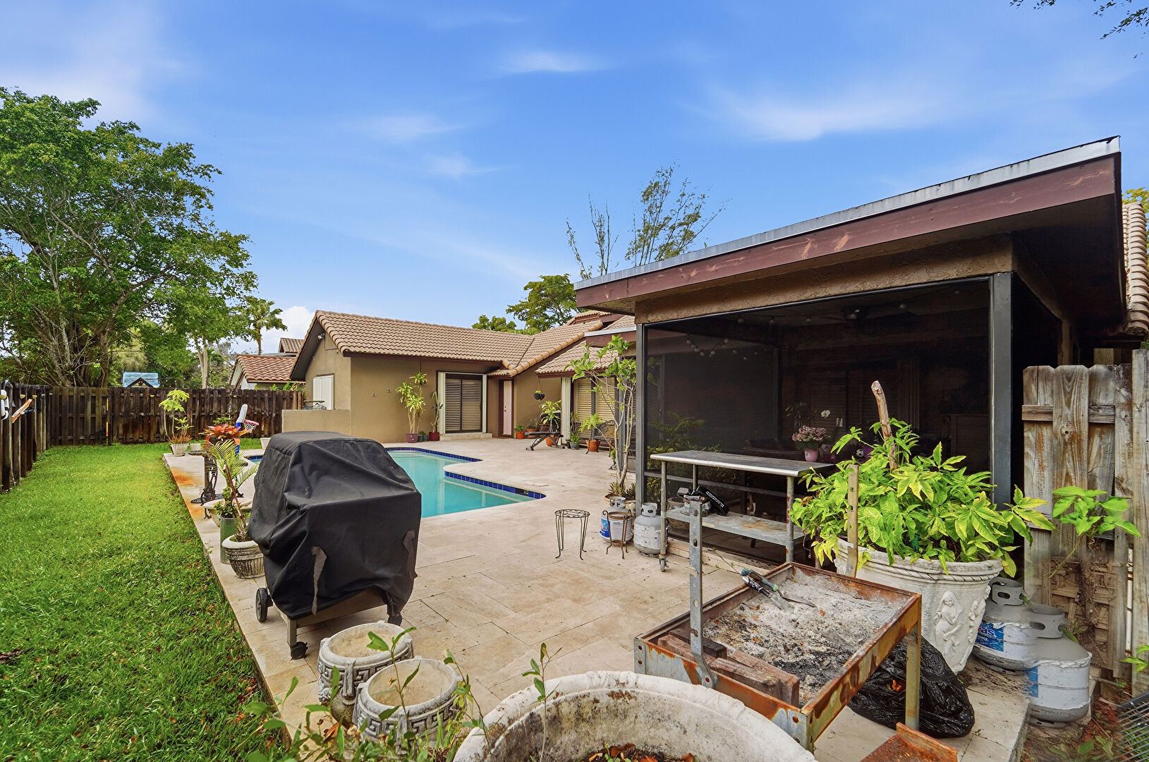 Fence, Grill, Patio, Pool, Sunroom, Lawn, Patio, Sunroom
