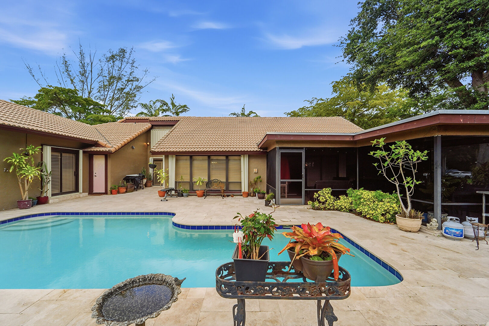 Patio, Pool, Stucco Siding, Tile Roof, Sunroom