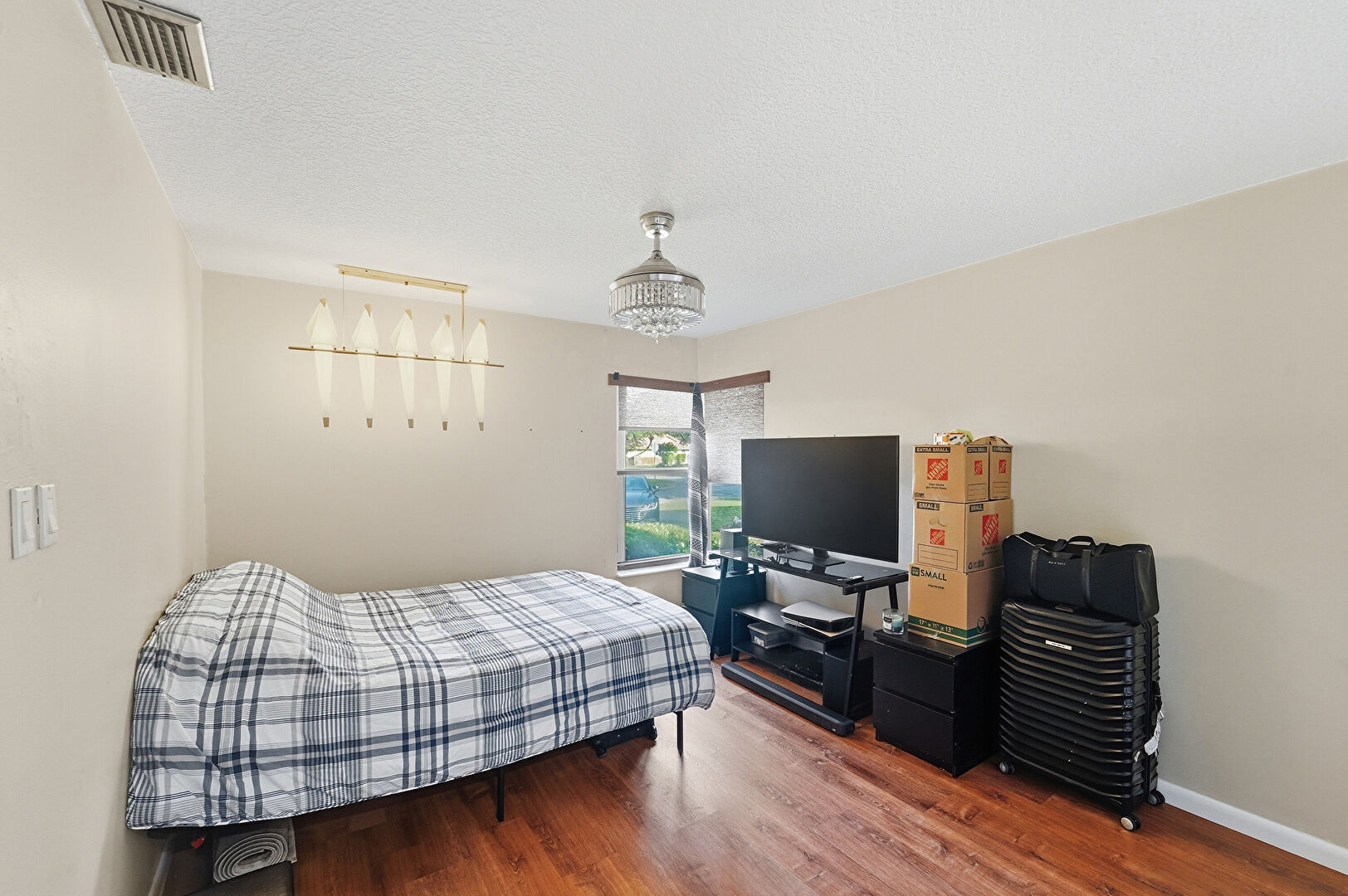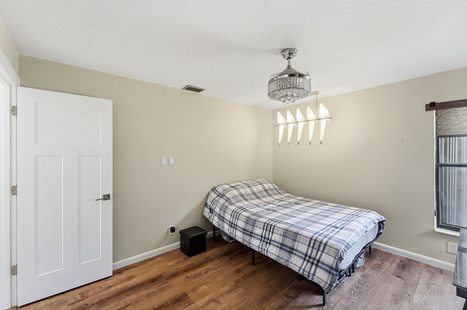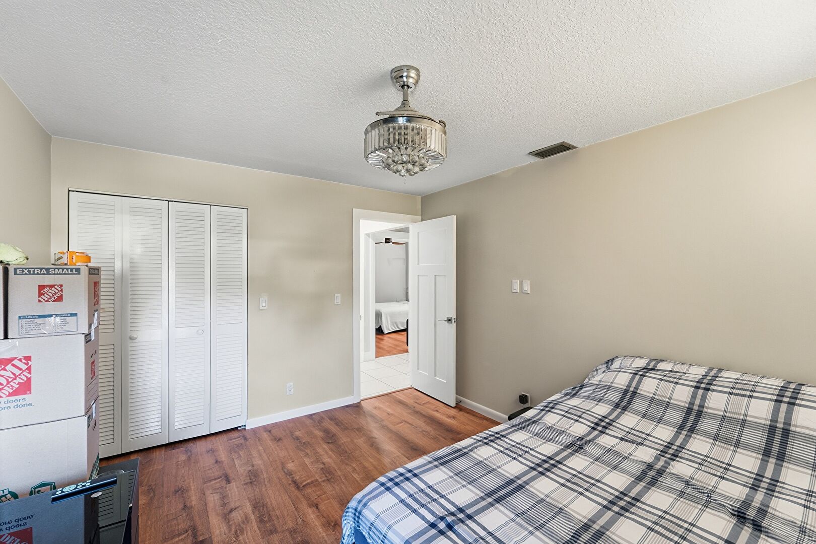 Baseboards Wall, Closet, Drywall, Natural Light, Notable Chandelier, Textured Ceiling, Vent, Wood Finish Floor, Drywall, Textured Ceiling, Wood Finish Floor