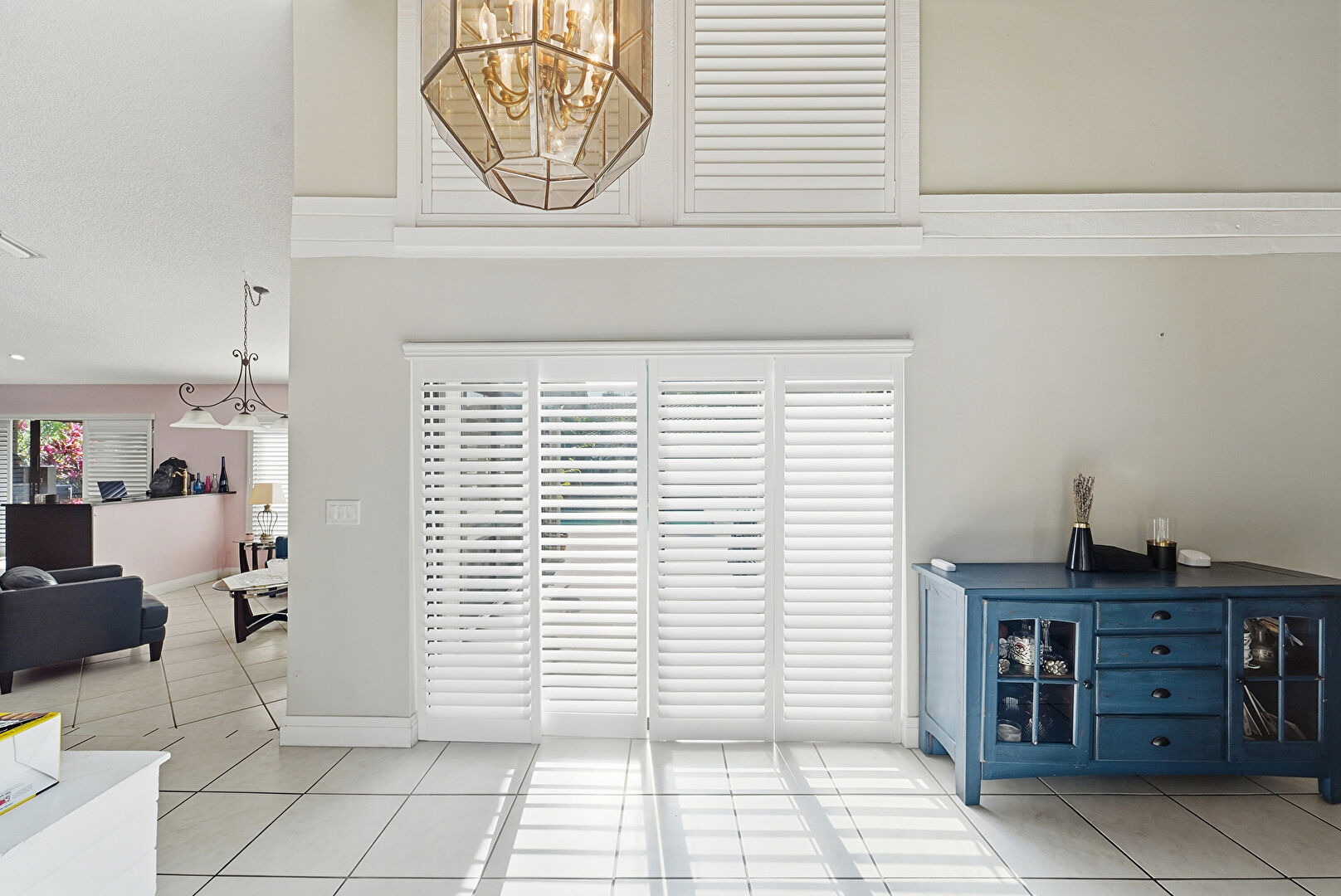 Baseboards Wall, High Ceiling, Natural Light, Notable Chandelier, Tile Floor, Drywall