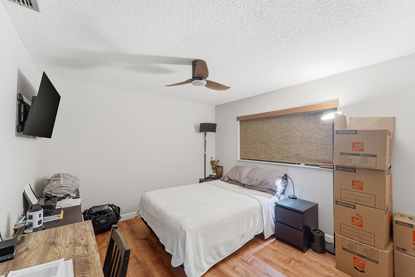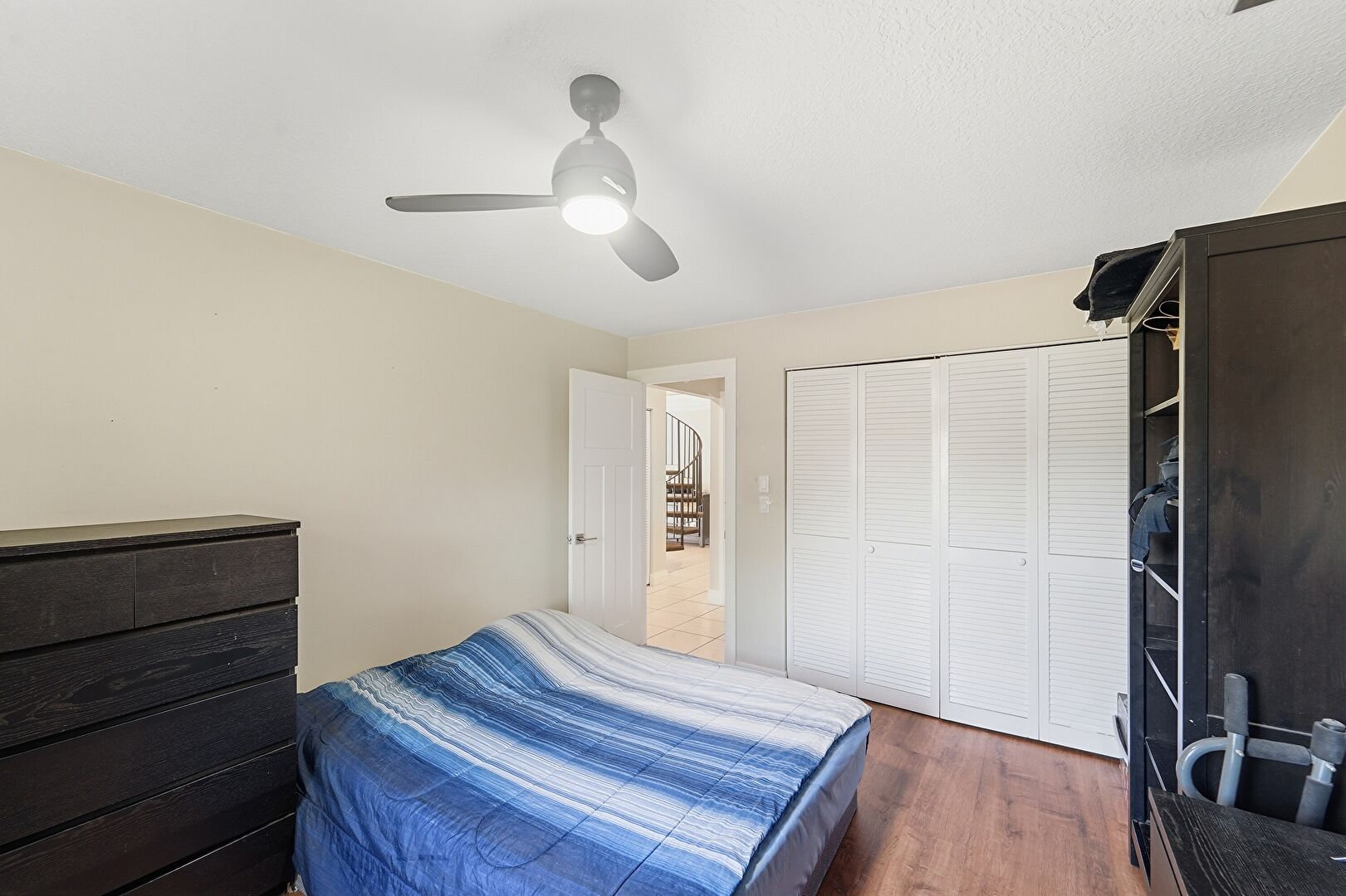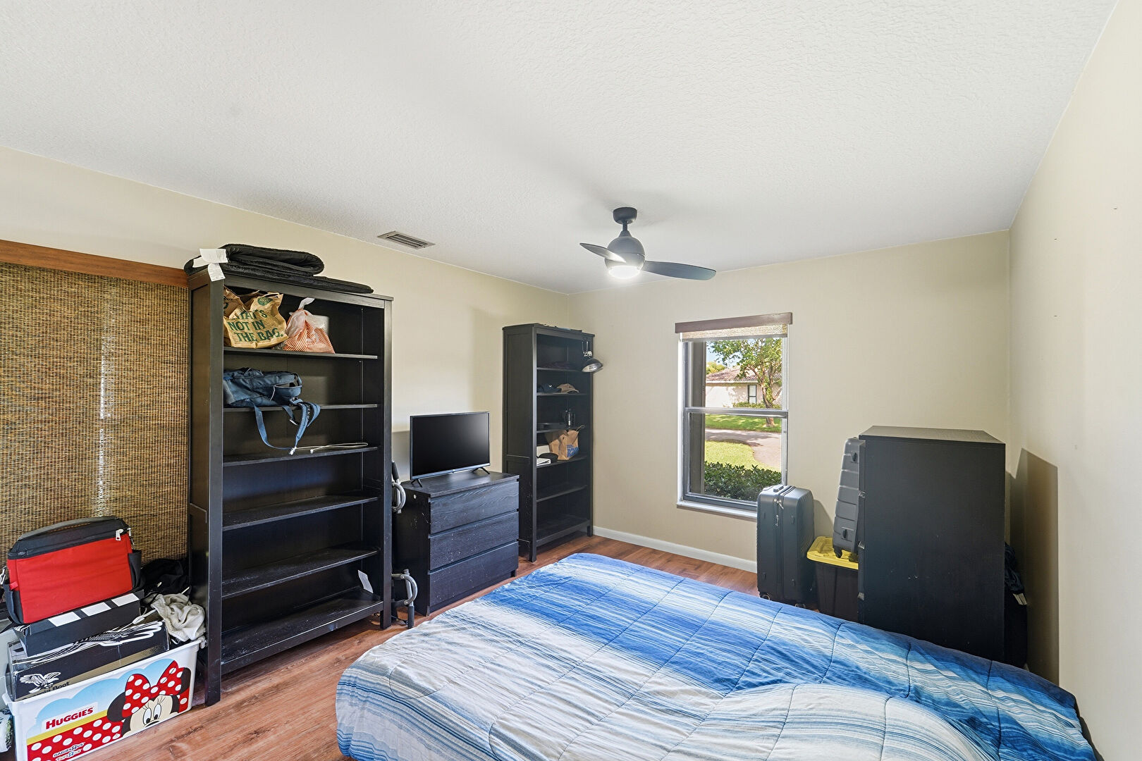 Baseboards Wall, Ceiling Fan, Closet, Drywall, Textured Ceiling, Vent, Wood Finish Floor, Drywall, Natural Light