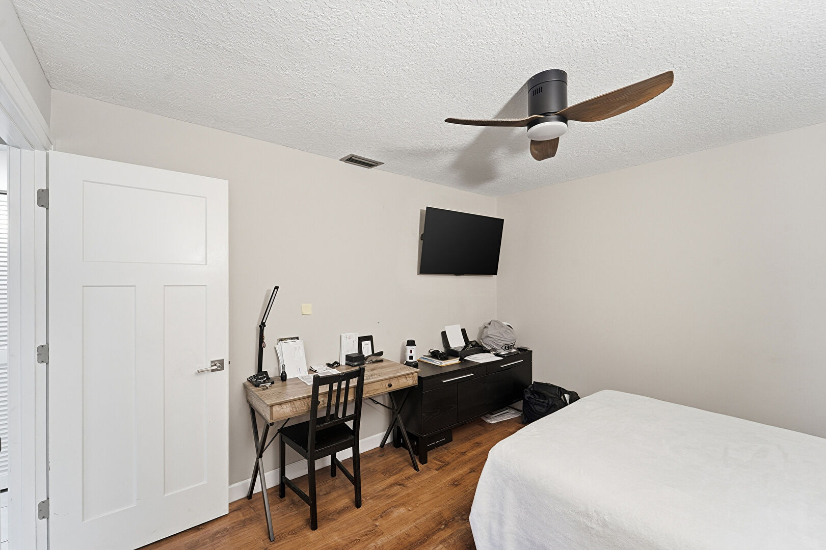 Baseboards Wall, Ceiling Fan, Drywall, Office Area, Textured Ceiling, Vent, Wood Finish Floor, Closet, Vent, Wood Finish Floor