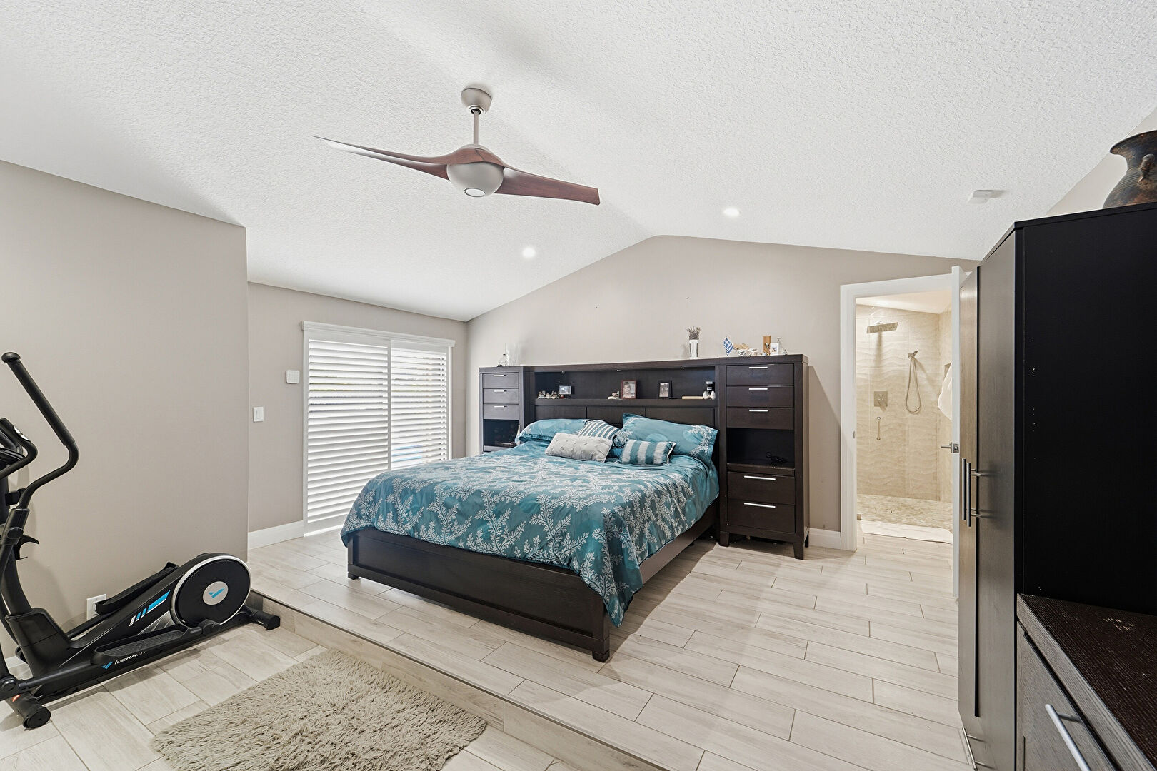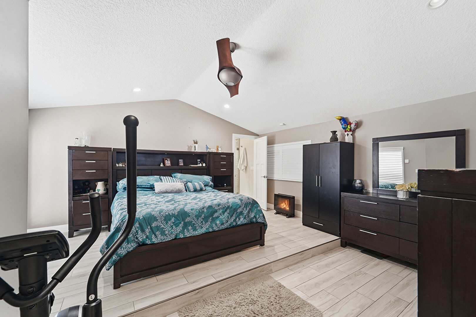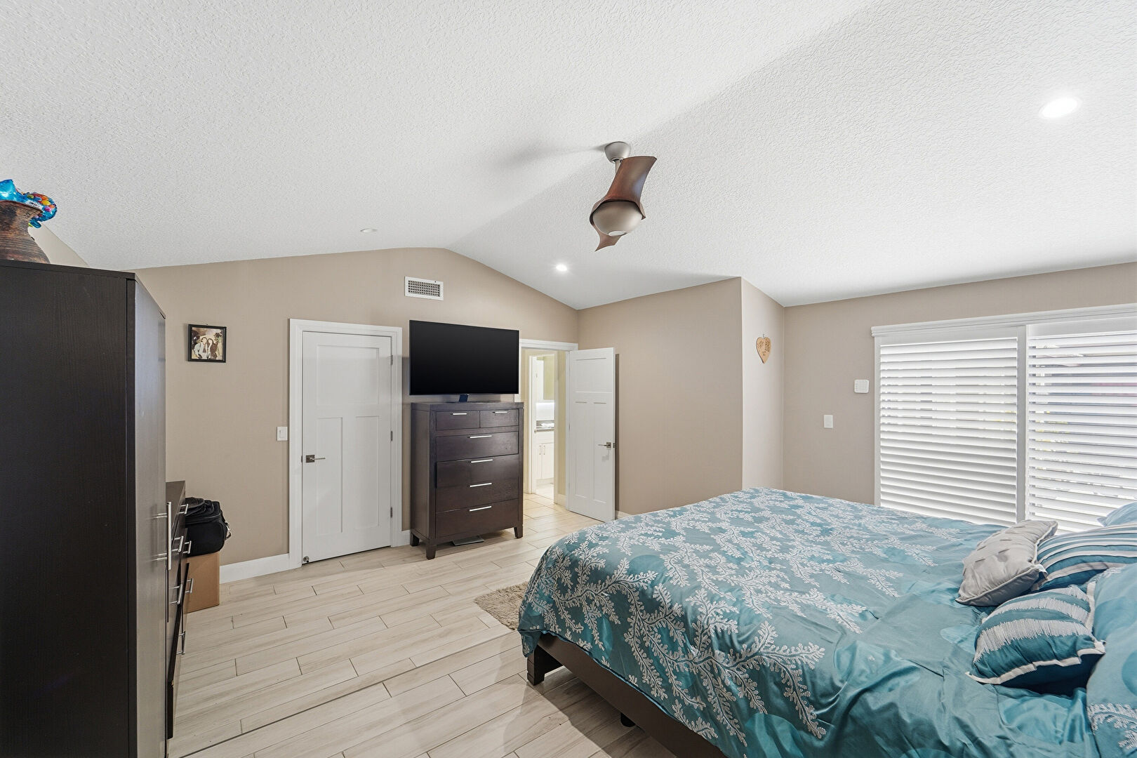 Baseboards Wall, Cathedral Ceiling, Ceiling Fan, Drywall, Ensuite Bathroom, Fireplace, Natural Light, Recessed Lighting, Textured Ceiling, Vaulted Ceiling, Vent, Wood Finish Floor, Natural Light, Textured Ceiling