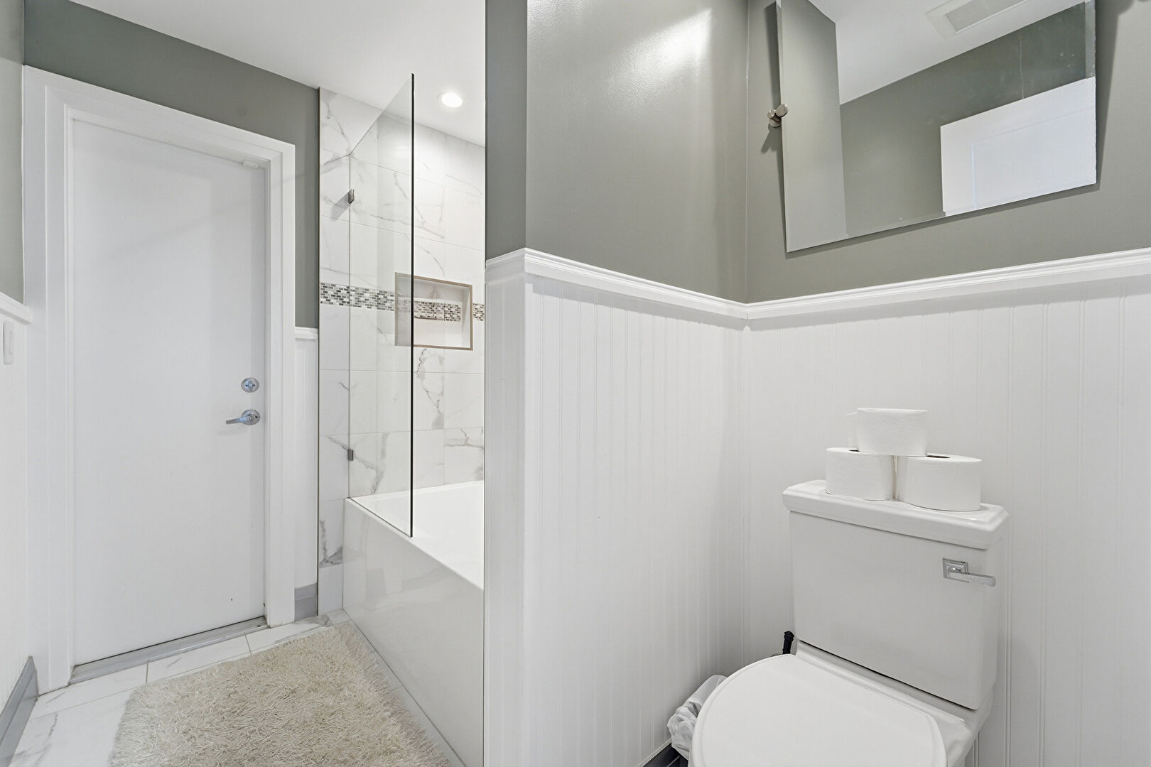 Baseboards Wall, Combined Bath Shower, Double Vanity, Drywall, Full Bathroom, Recessed Lighting, Vaulted Ceiling, Vent, Wainscot Wall, Wood Wall, Drywall, Marble Finish Floor