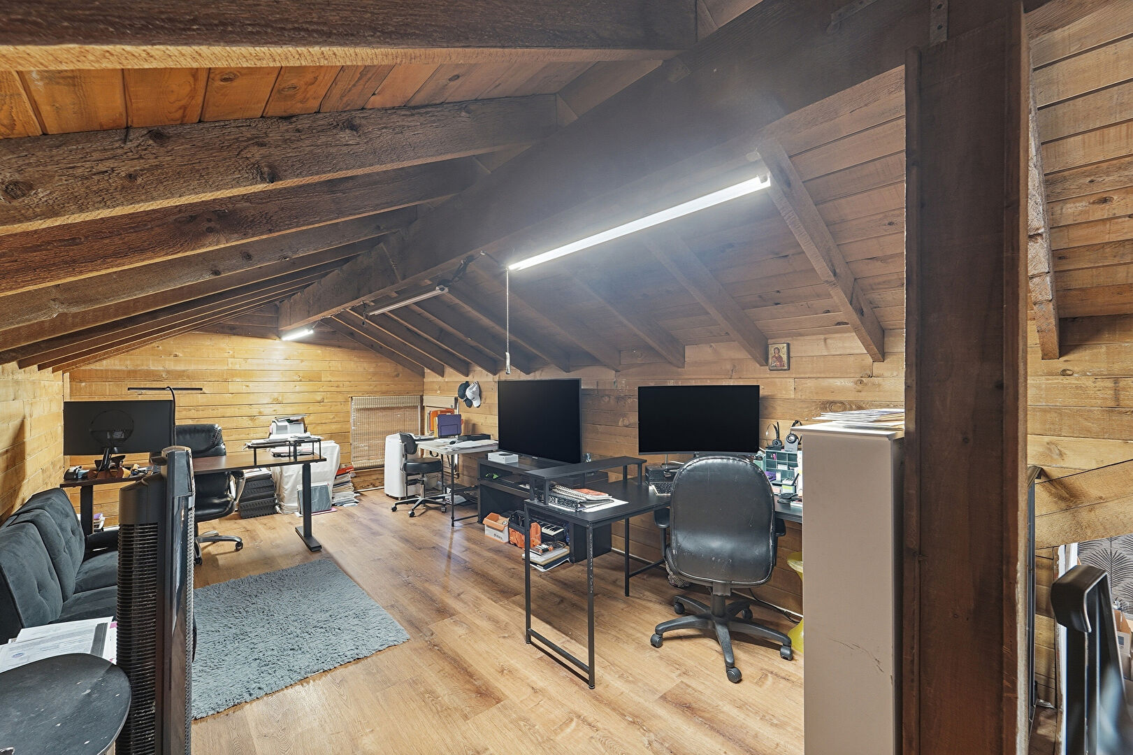 Beamed Ceiling, Cathedral Ceiling, Office Area, Vaulted Ceiling, Wood Finish Floor, Wood Wall, Wood Ceiling