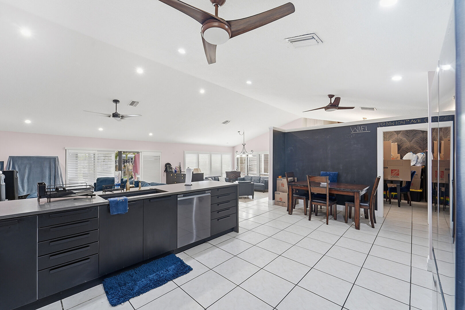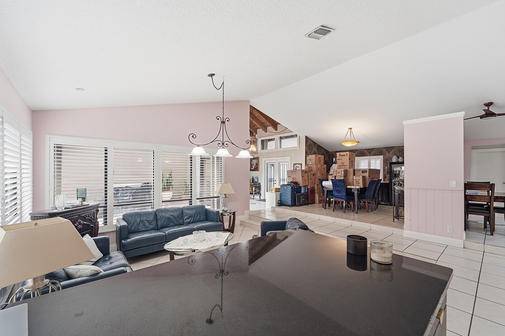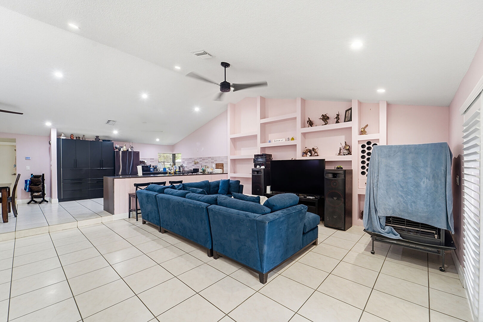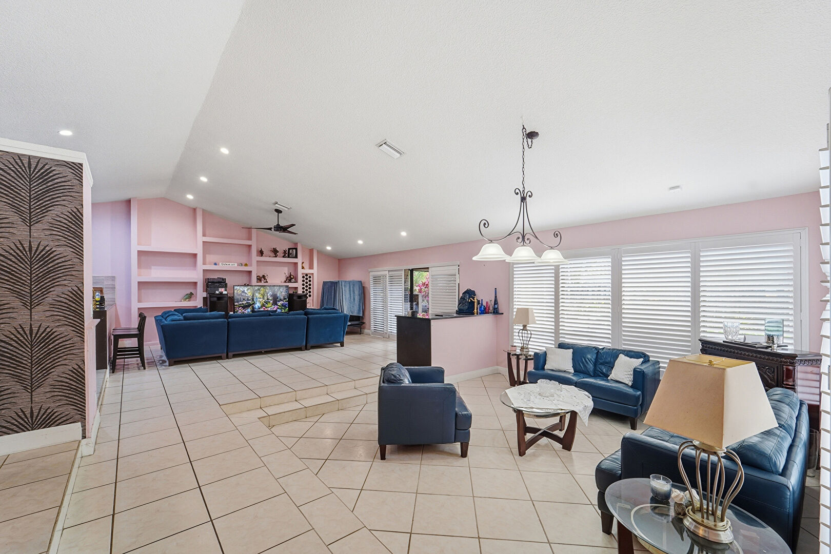 Baseboards Wall, Built In Shelves, Cathedral Ceiling, Ceiling Fan, Drywall, High Ceiling, L Shaped Kitchen, Natural Light, Notable Chandelier, Recessed Lighting, Tile Floor, Vaulted Ceiling, Vent, Wainscot Wall, Ceiling Fan, High Ceiling, Tile Floor