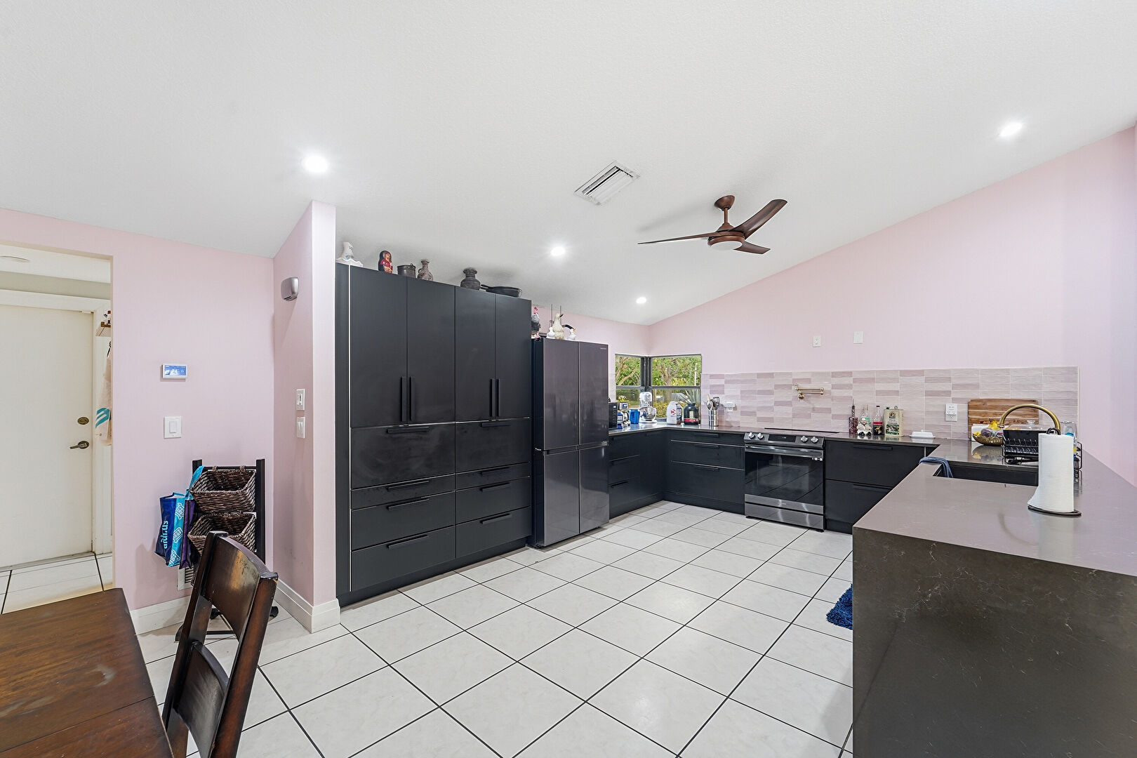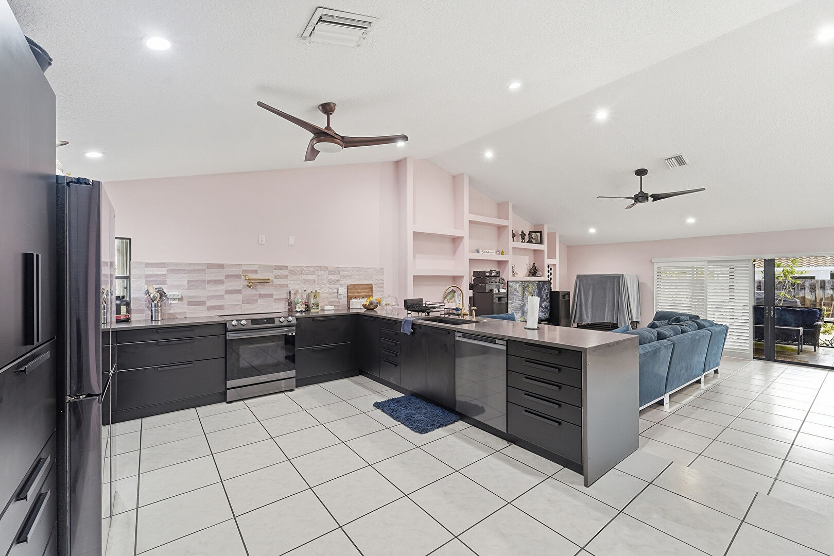 Baseboards Wall, Black Cabinets, Cathedral Ceiling, Ceiling Fan, Drywall, Flat Panel Cabinets, Gray Cabinets, High Ceiling, Kitchen Peninsula, Natural Light, Notable Chandelier, Open Shelves, Opens To Living Area, Recessed Lighting, Stone Countertops, Tile Floor, U Shaped Kitchen, Vaulted Ceiling, Vent, Black Cabinets, Opens To Living Area, U Shaped Kitchen