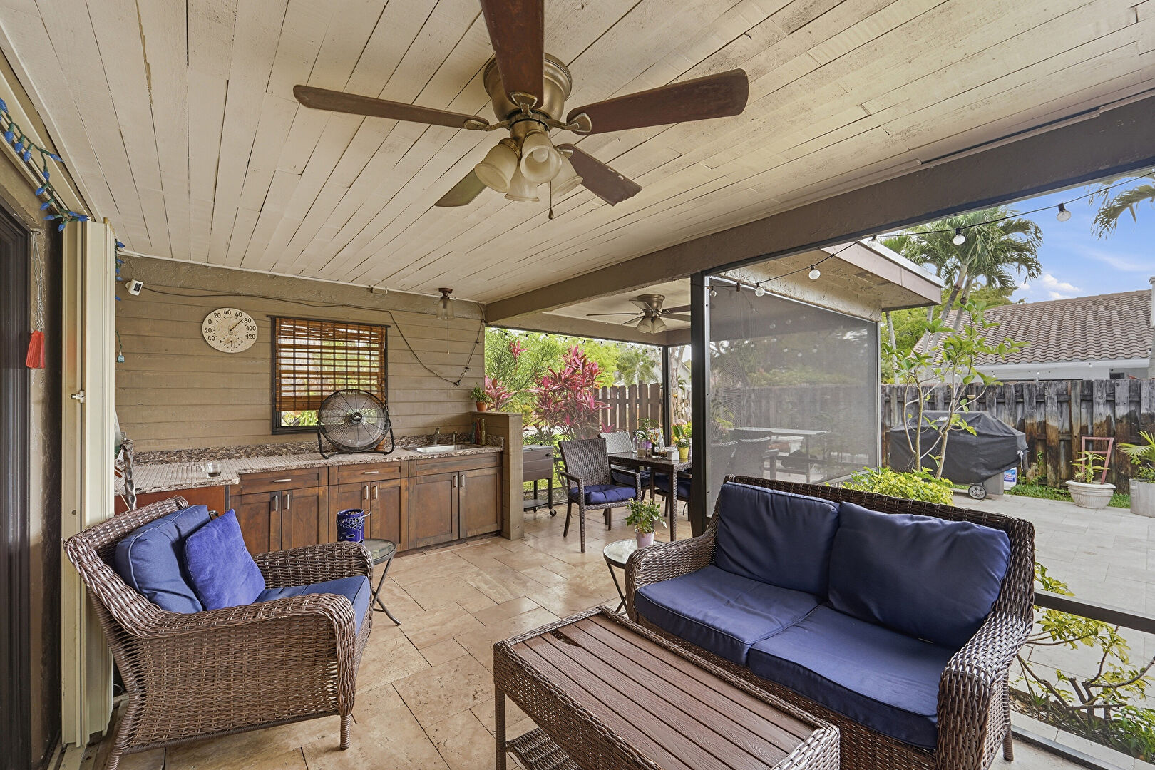 Beamed Ceiling, Ceiling Fan, Grill, Natural Light, Outdoor Kitchen, Outdoor Living Space, Patio, Sunroom, Outdoor Dining Area, Sunroom