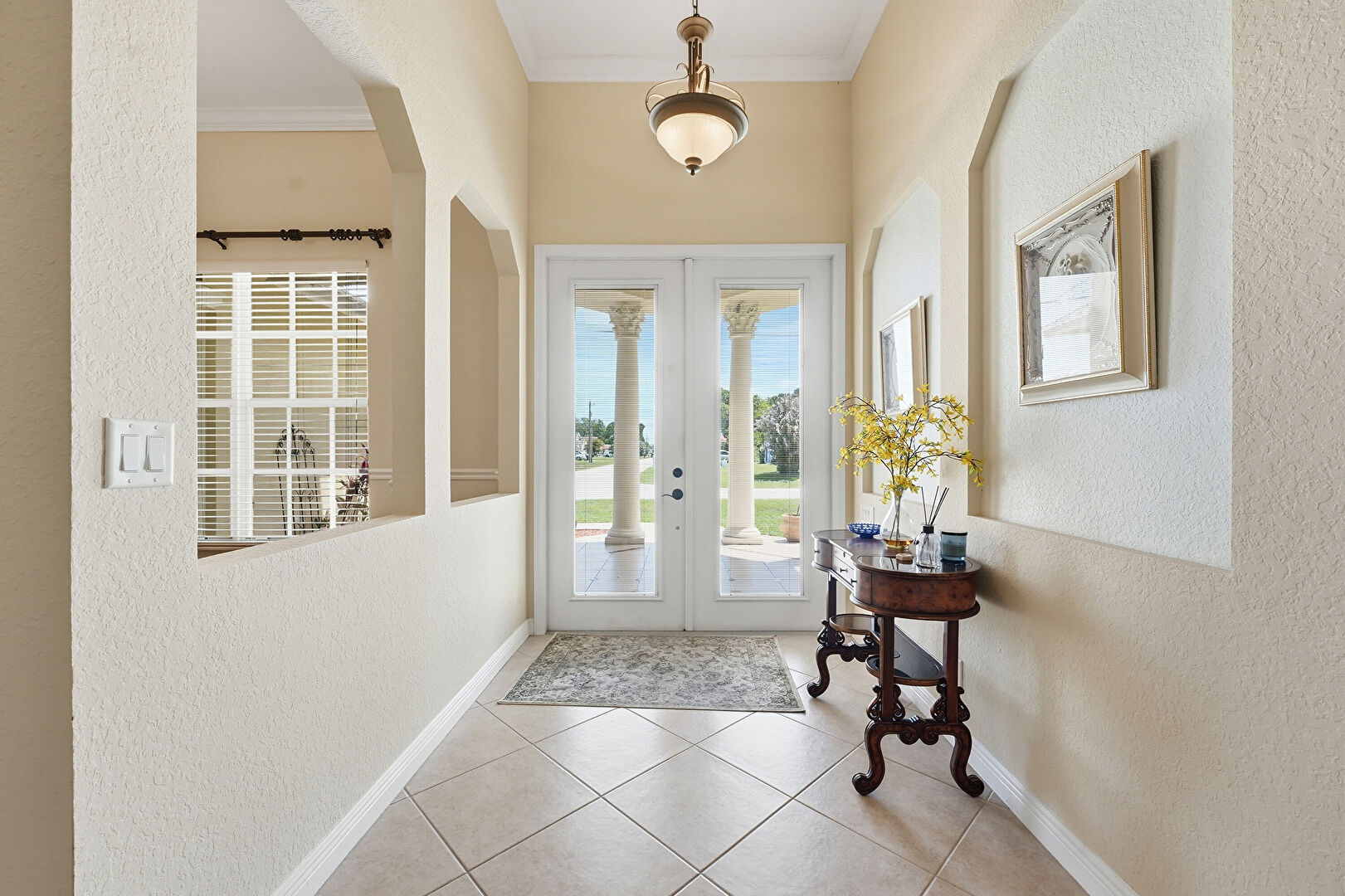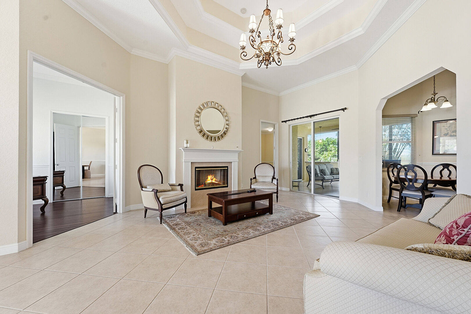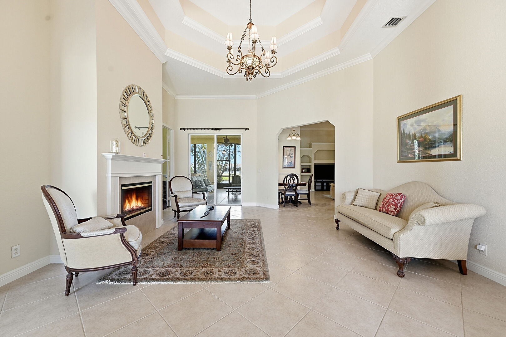 Arched Walkways, Baseboards Wall, Crown Molding, Drywall, Fireplace, French Doors, High Ceiling, Natural Light, Notable Chandelier, Tile Floor, Tray Ceiling, Vent, Baseboards Wall, High Ceiling, Natural Light