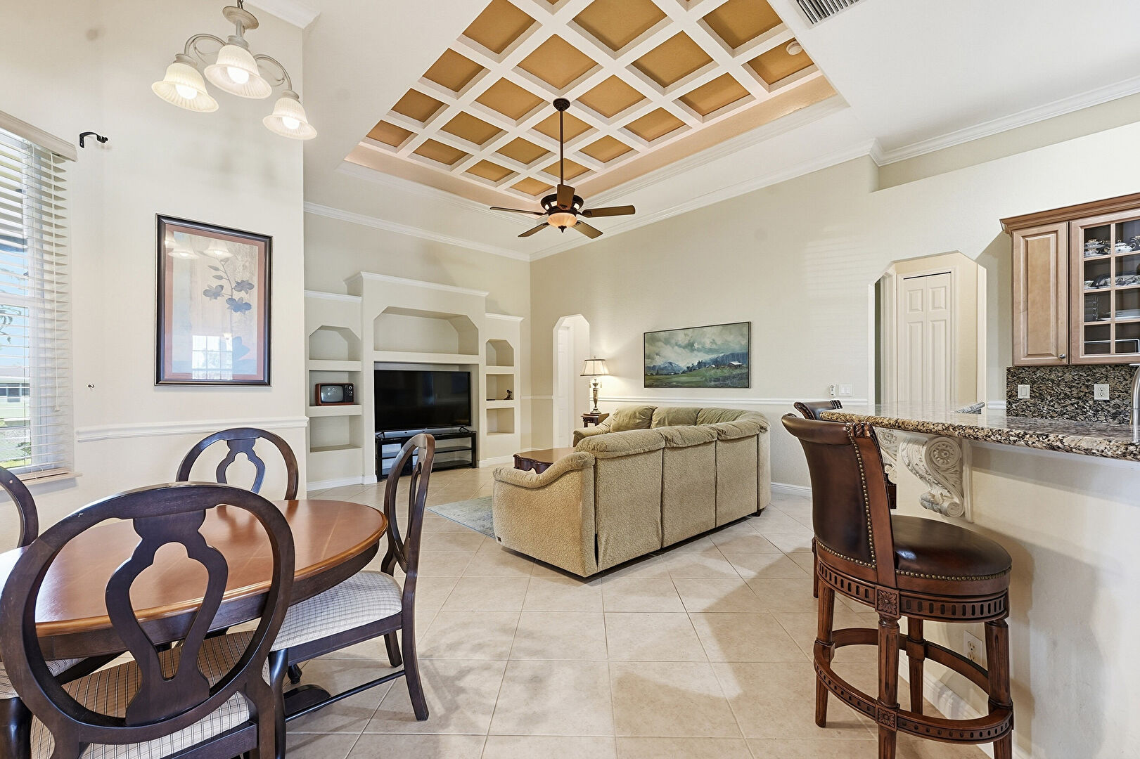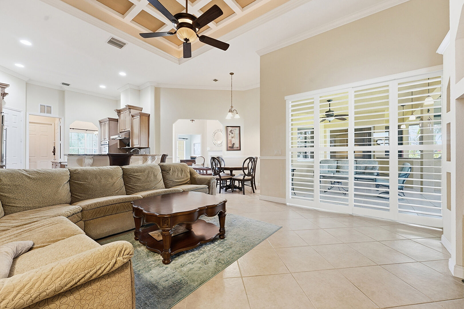 Arched Walkways, Baseboards Wall, Built In Shelves, Ceiling Fan, Coffered Ceiling, Crown Molding, Drywall, High Ceiling, Natural Light, Recessed Lighting, Tile Floor, Vent, Baseboards Wall, Tile Floor