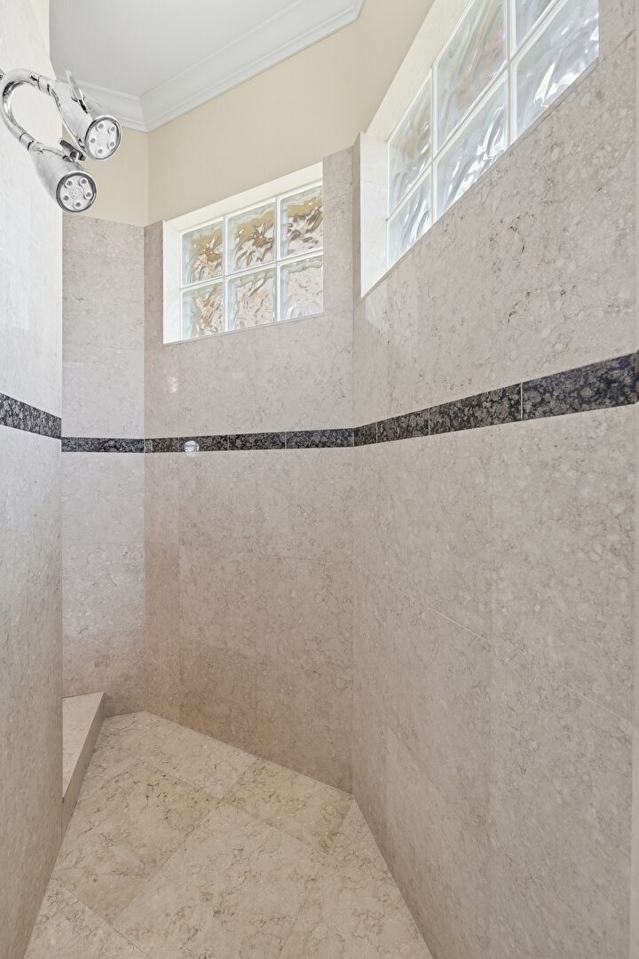 Combined Bath Shower, Crown Molding, Drywall, Natural Light, Vanity, Full Bathroom