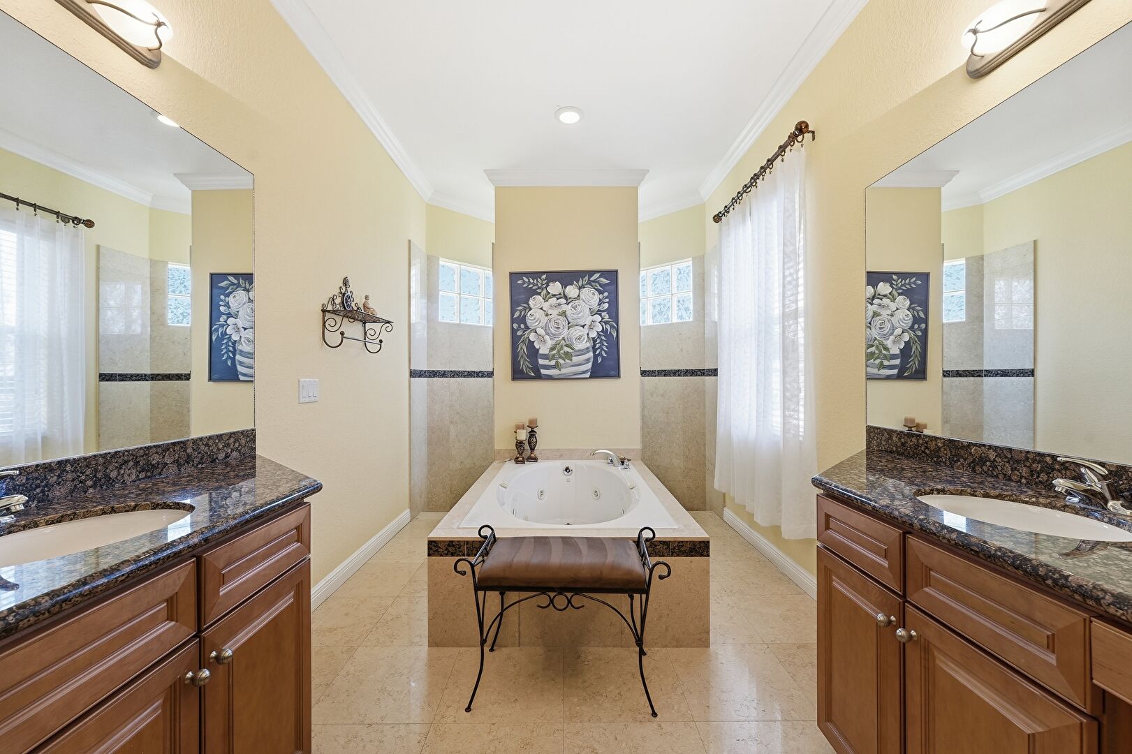 Baseboards Wall, Crown Molding, Drywall, Ensuite Bathroom, Full Bathroom, Natural Light, Tile Floor, Two Single Vanities, Vent, Natural Light, Tile Floor, Two Single Vanities