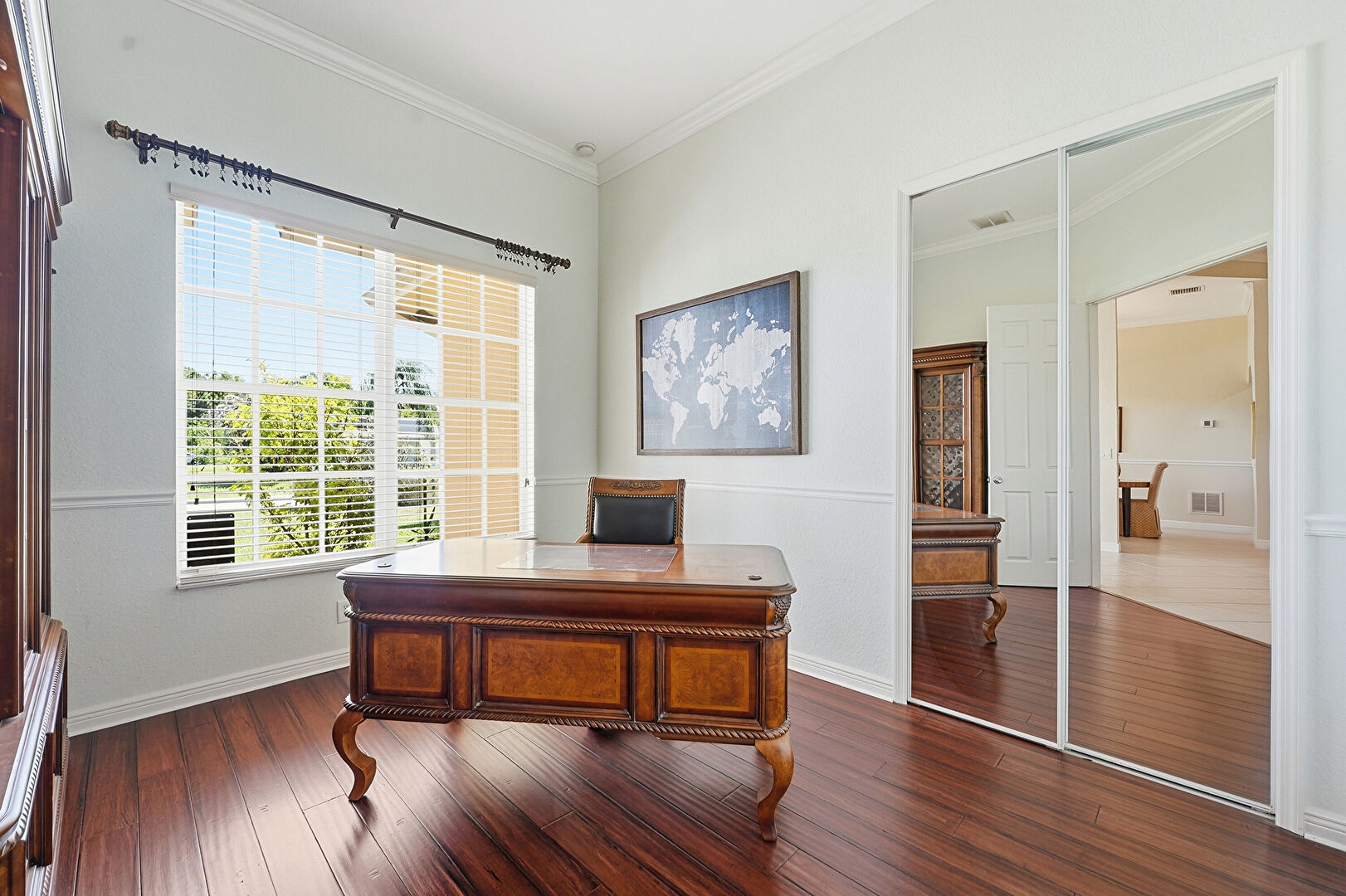 Baseboards Wall, Drywall, Natural Light, Office Area, Vent, Wood Finish Floor, Crown Molding