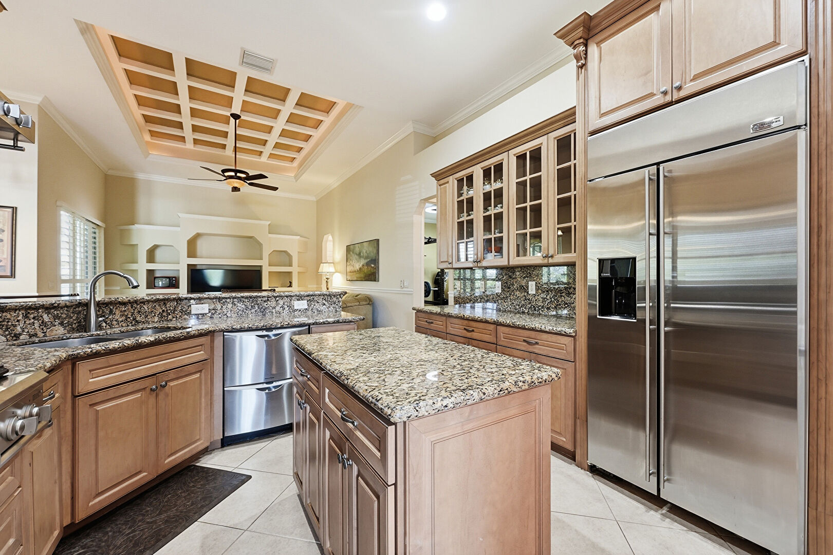 Arched Walkways, Baseboards Wall, Beamed Ceiling, Ceiling Fan, Coffered Ceiling, Crown Molding, Crown Molding Cabinets, Double Oven, Drywall, Glass Insert Cabinets, High Ceiling, Kitchen Bar, Kitchen Island, Kitchen Peninsula, Medium Brown Cabinets, Natural Light, Notable Chandelier, Opens To Living Area, Pendant Lighting, Raised Cabinets, Recessed Lighting, Stone Countertops, Tile Floor, Vent, Coffered Ceiling, Double Oven, G Shaped Kitchen, Vent