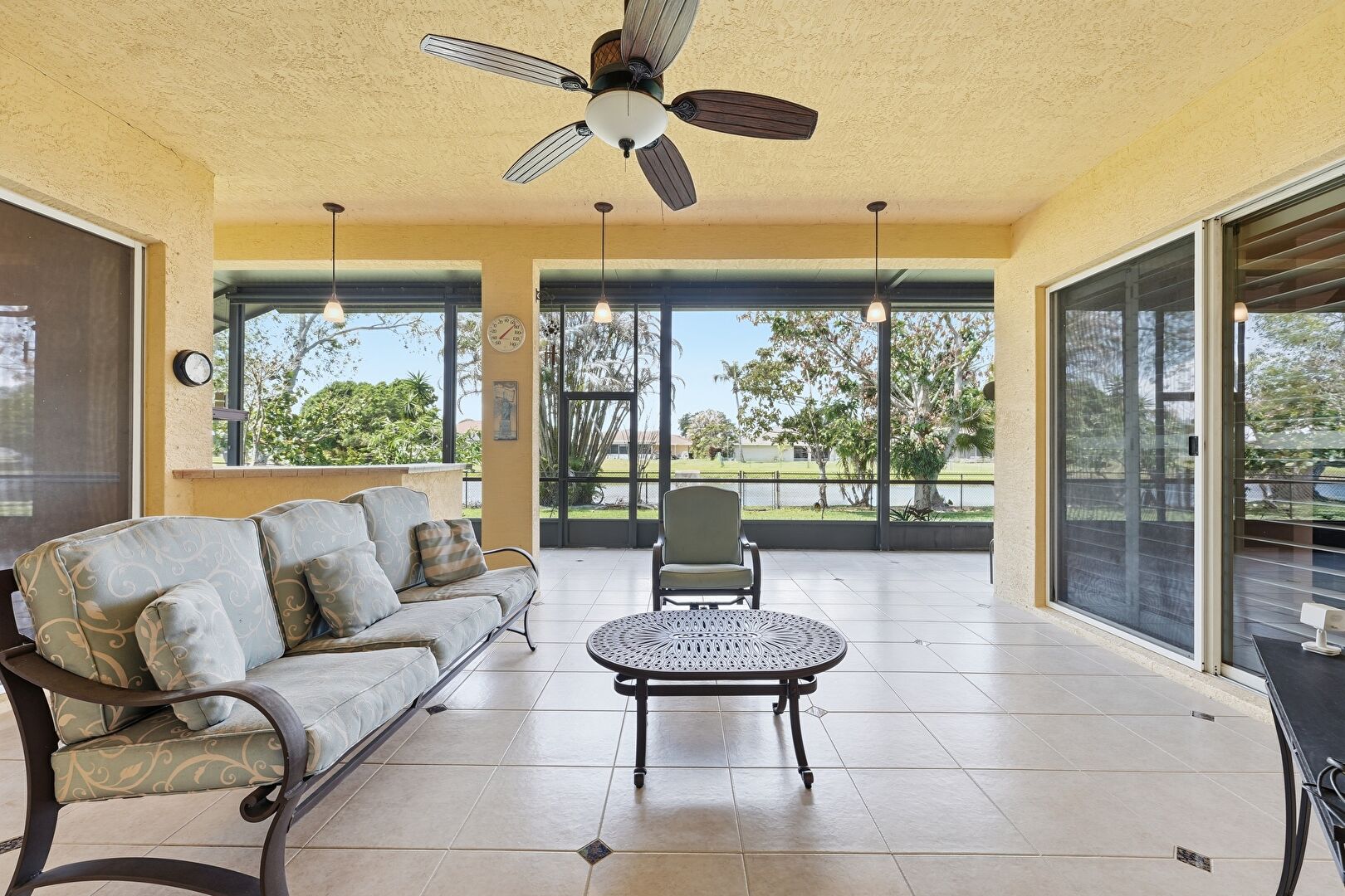 Ceiling Fan, Natural Light, Patio, Textured Ceiling, Textured Wall, Tile Floor, Water View, Outdoor Living Space, Sunroom, Waterfront