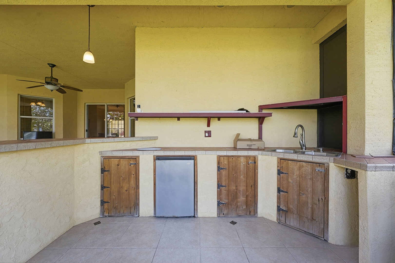 Ceiling Fan, Medium Brown Cabinets, Open Shelves, Pendant Lighting, Tile Countertops, Tile Floor, Textured Wall