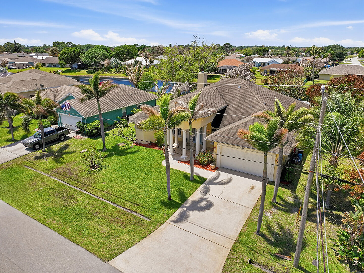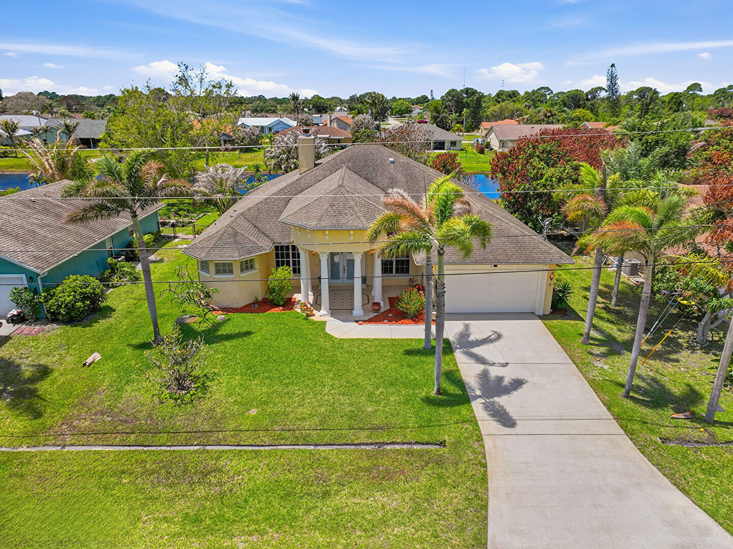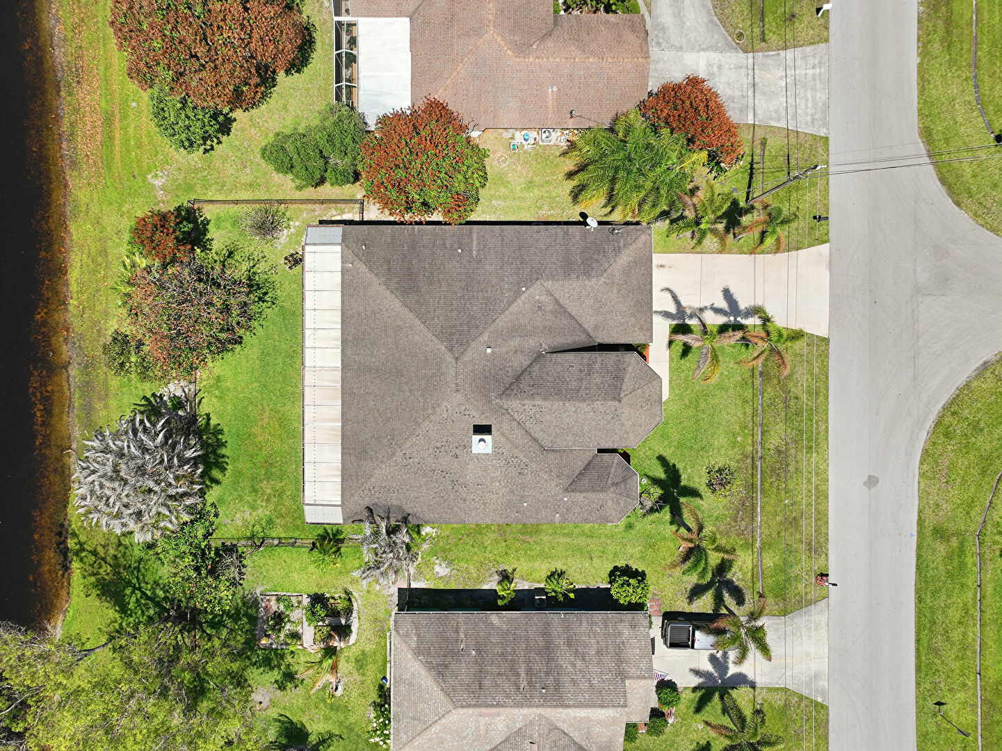 Chimney, Driveway, Fence, French Doors, Lawn, Porch, Residential View, Shingle Roof, Stucco Siding, Woods View, Chimney, Downspout, Lawn, Water View