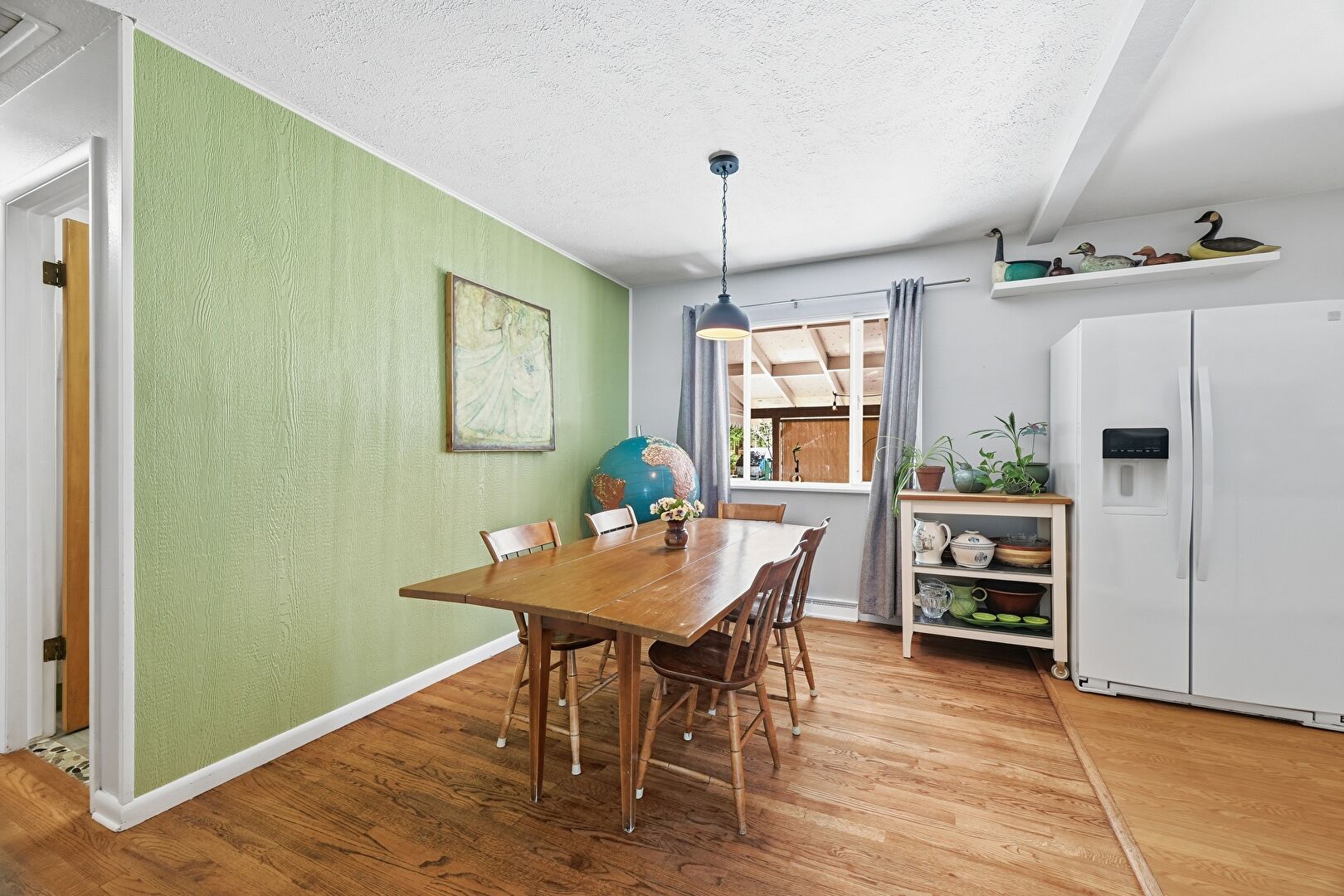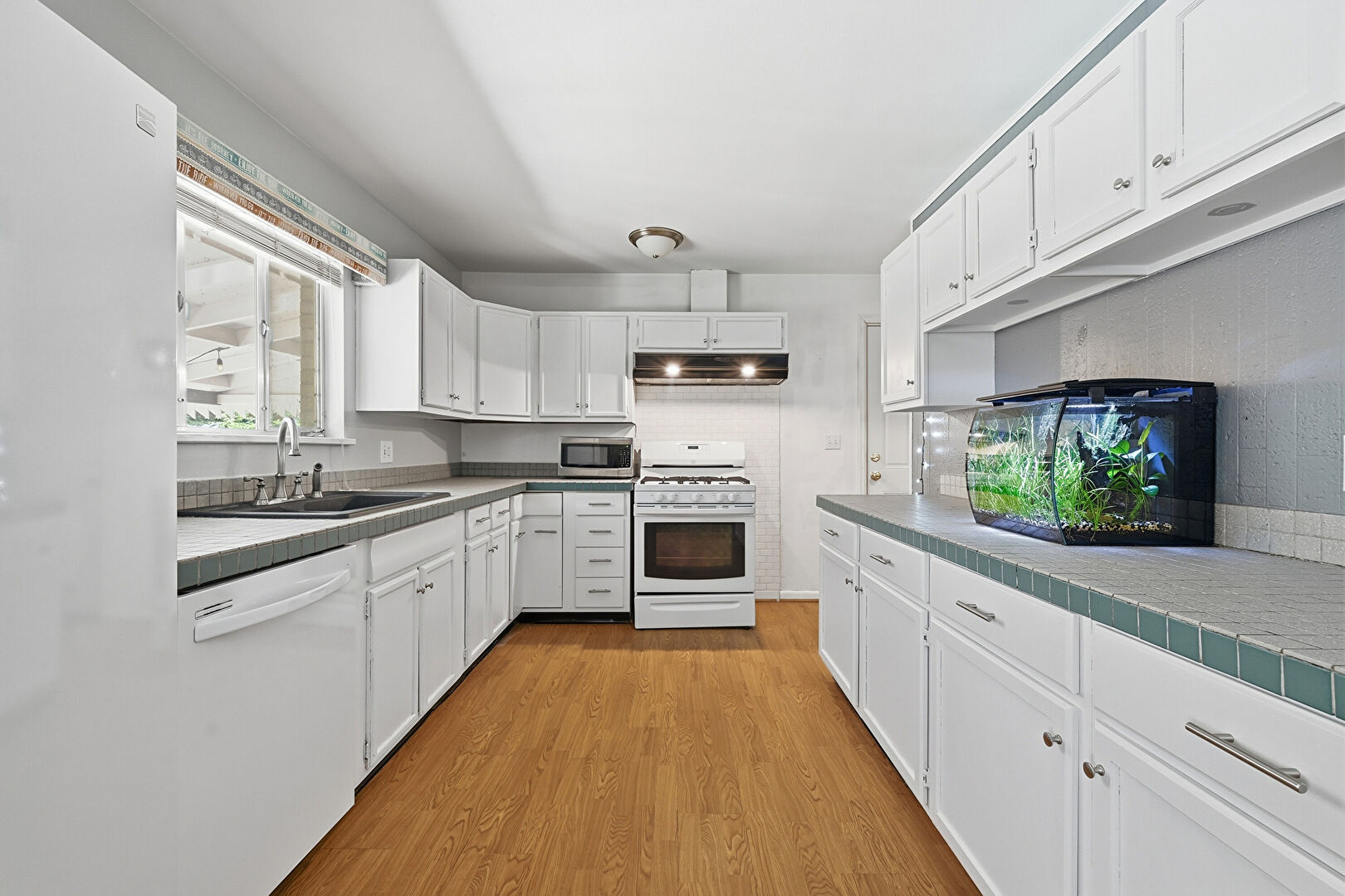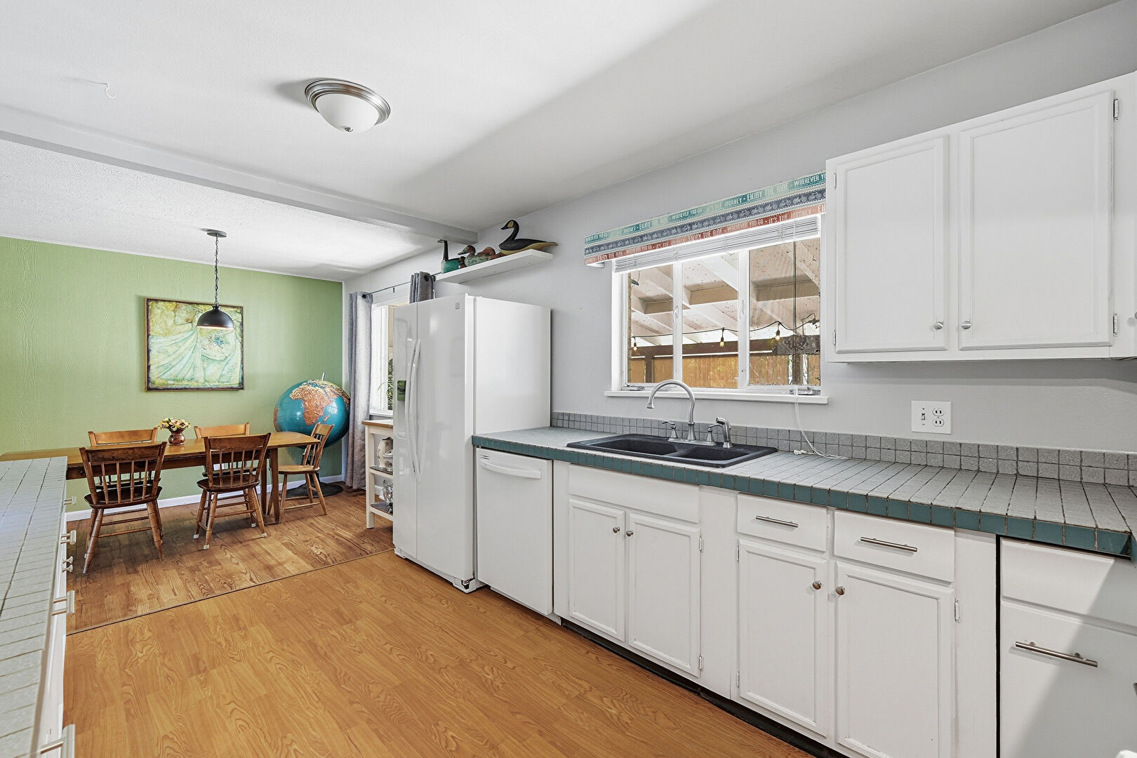 Drywall, Natural Light, Pendant Lighting, Shaker Cabinets, Tile Countertops, Visible Hinge Cabinets, Wood Finish Floor, Baseboards Wall, Wood Finish Floor