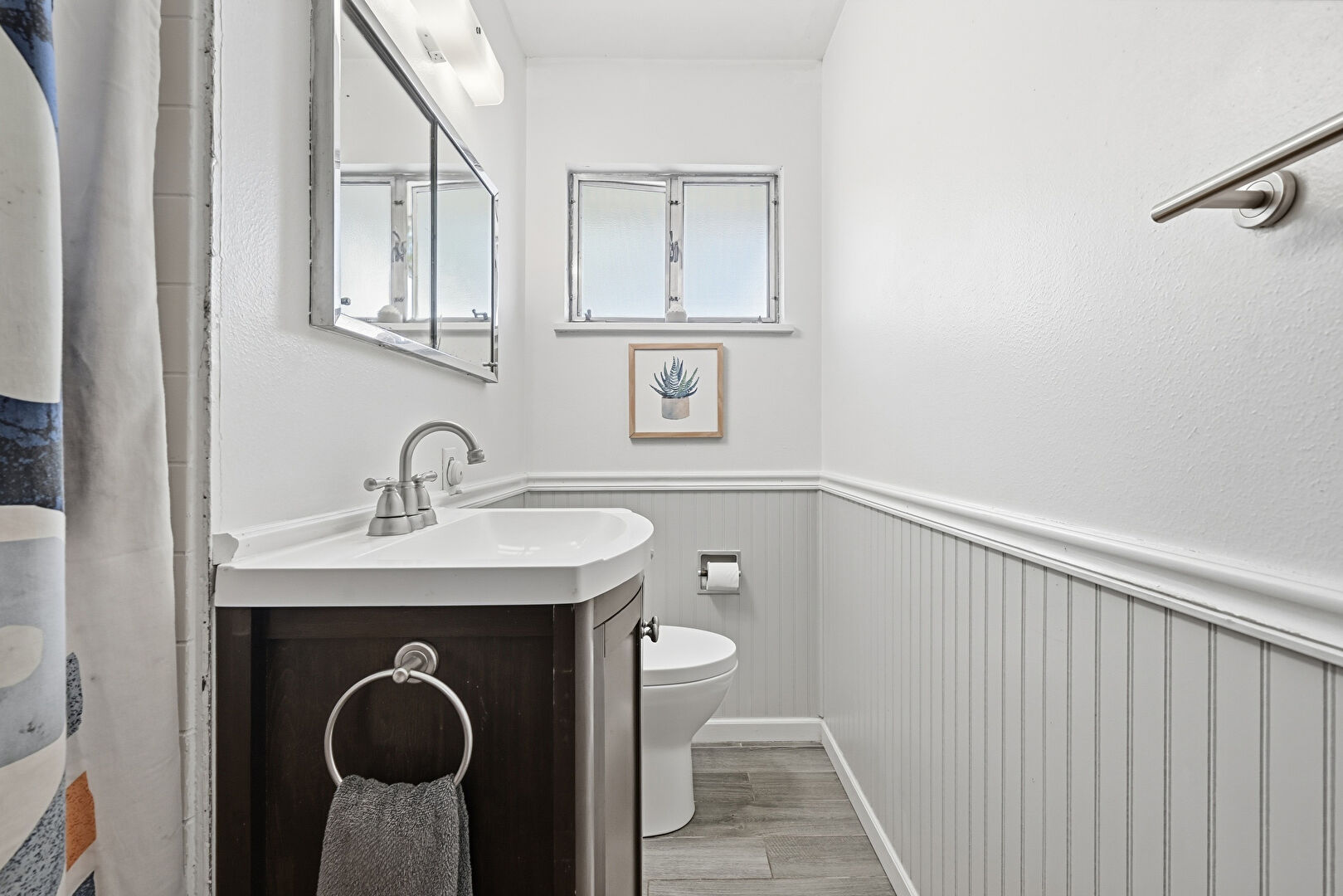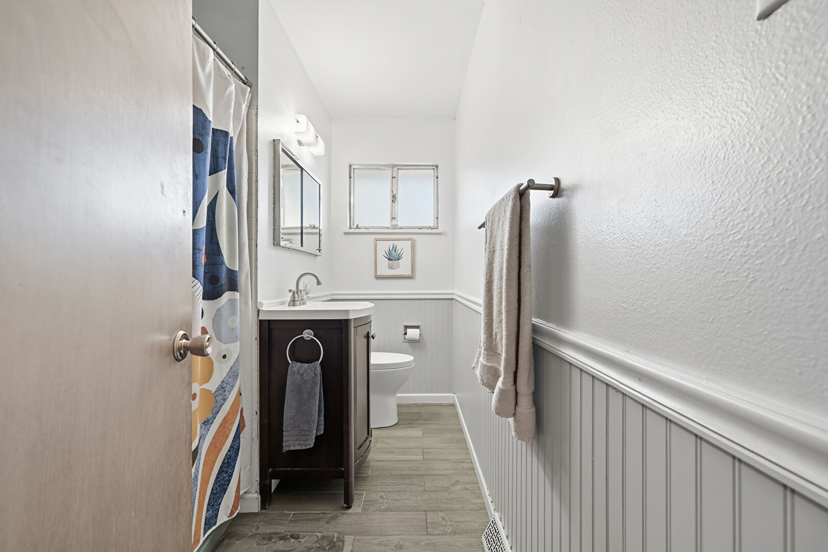 Combined Bath Shower, Drywall, Full Bathroom, Natural Light, Paneling Wall, Vanity, Wainscot Wall, Wood Finish Floor, Drywall, Textured Wall