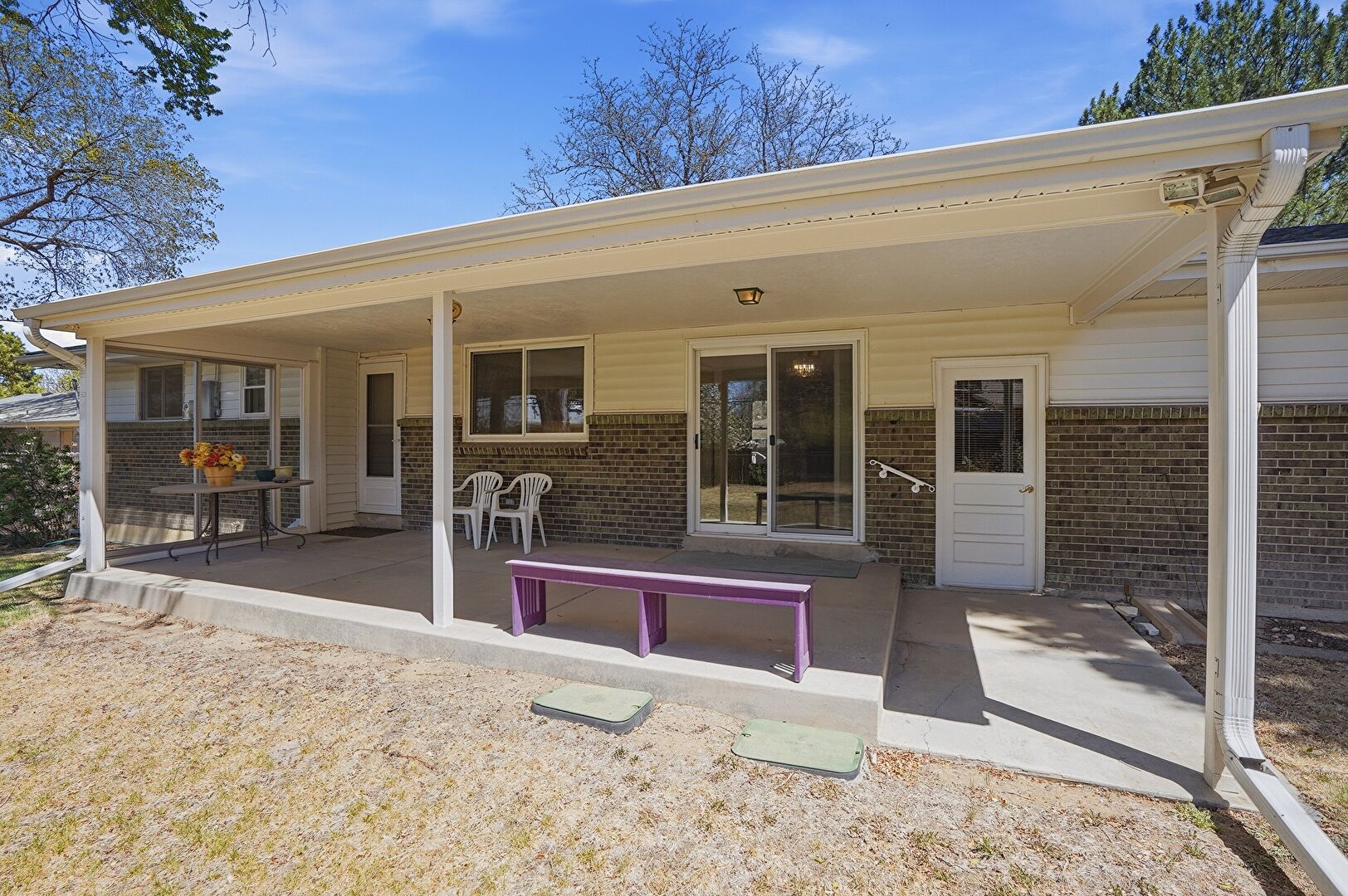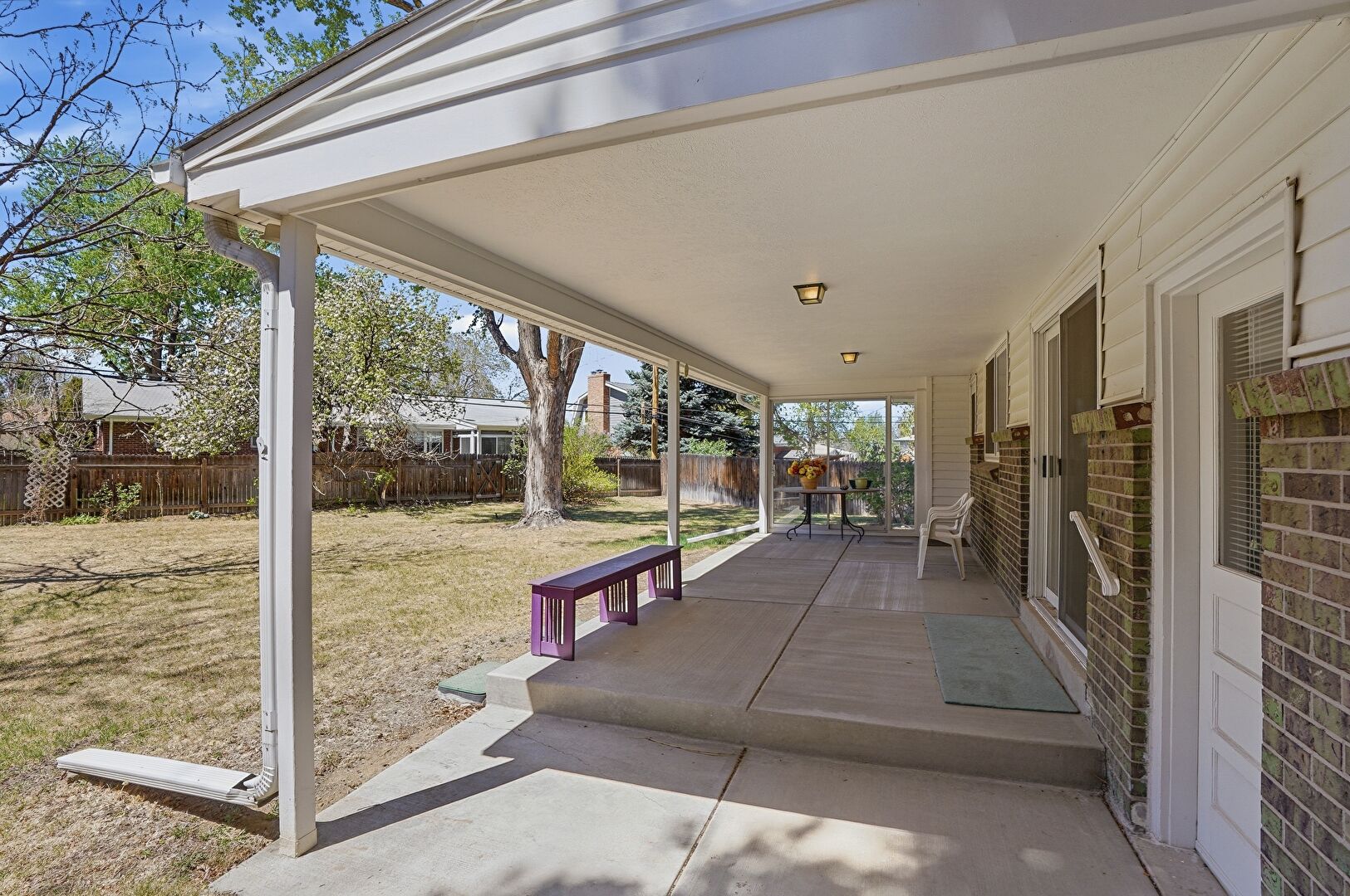 Downspout, Fence, Gutters, Horizontal Siding, Lawn, Patio, Porch, Brick Siding, Porch