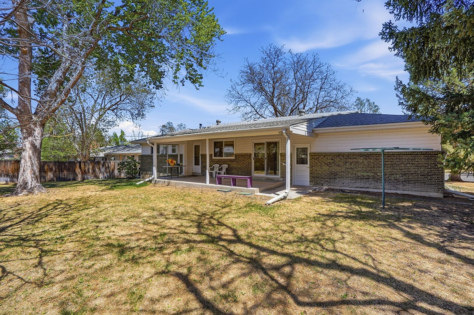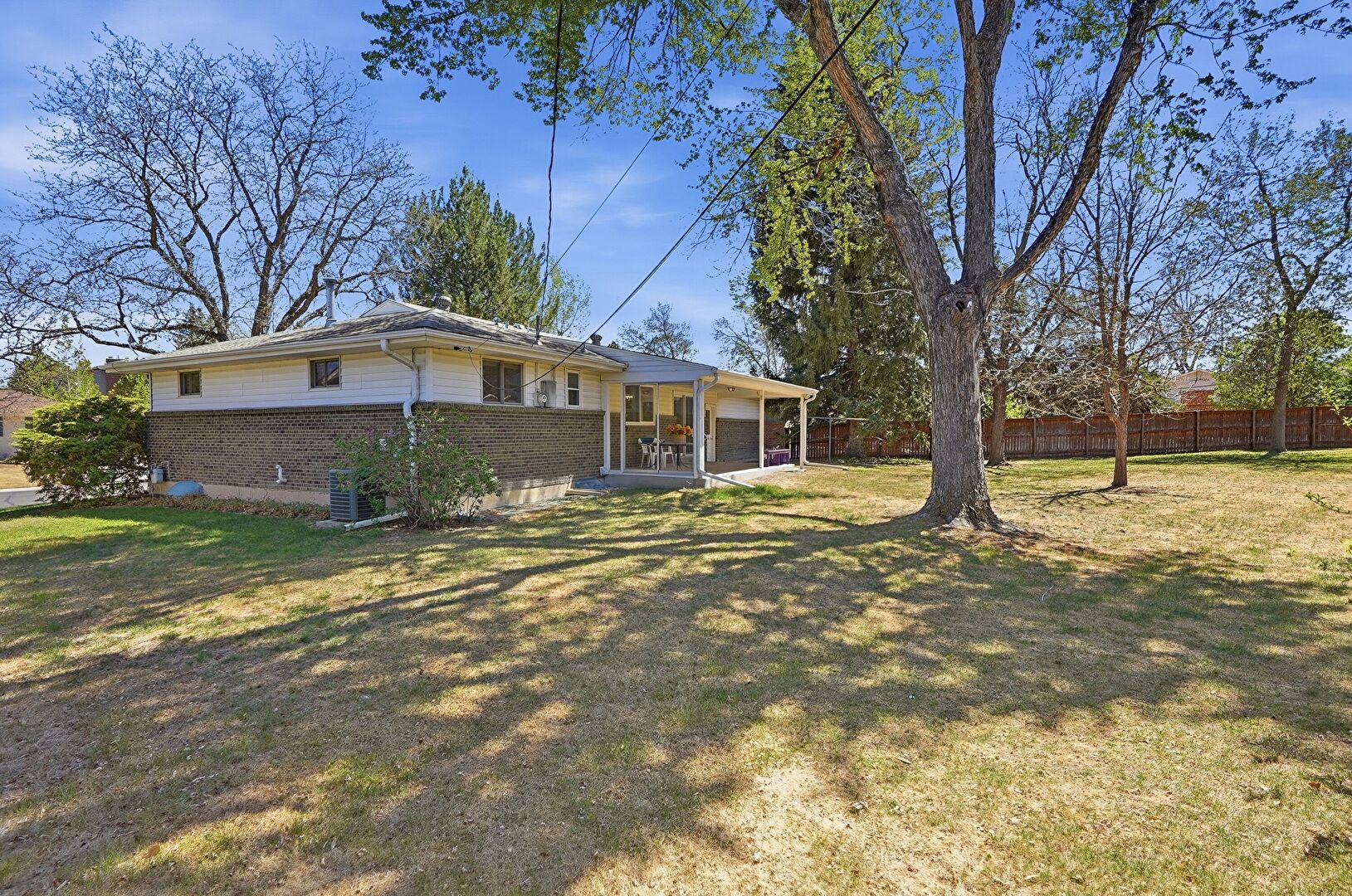 Brick Siding, Chimney, Concrete Foundation, Downspout, Driveway, Fence, Horizontal Siding, Lawn, Shingle Roof, Fence, Horizontal Siding, Lawn