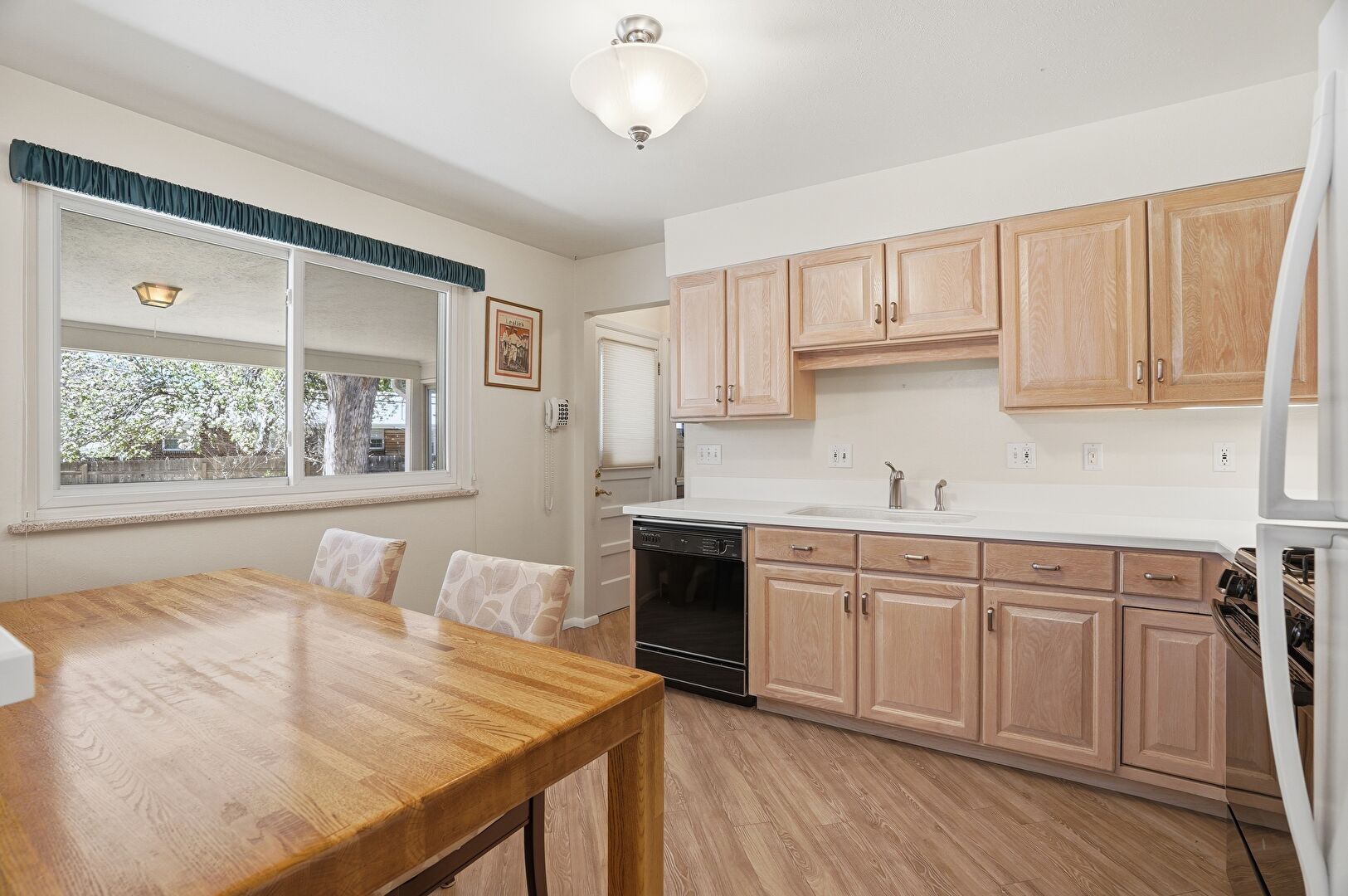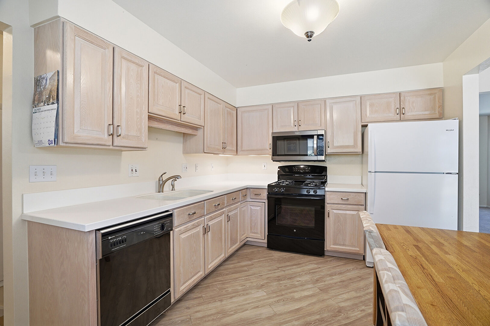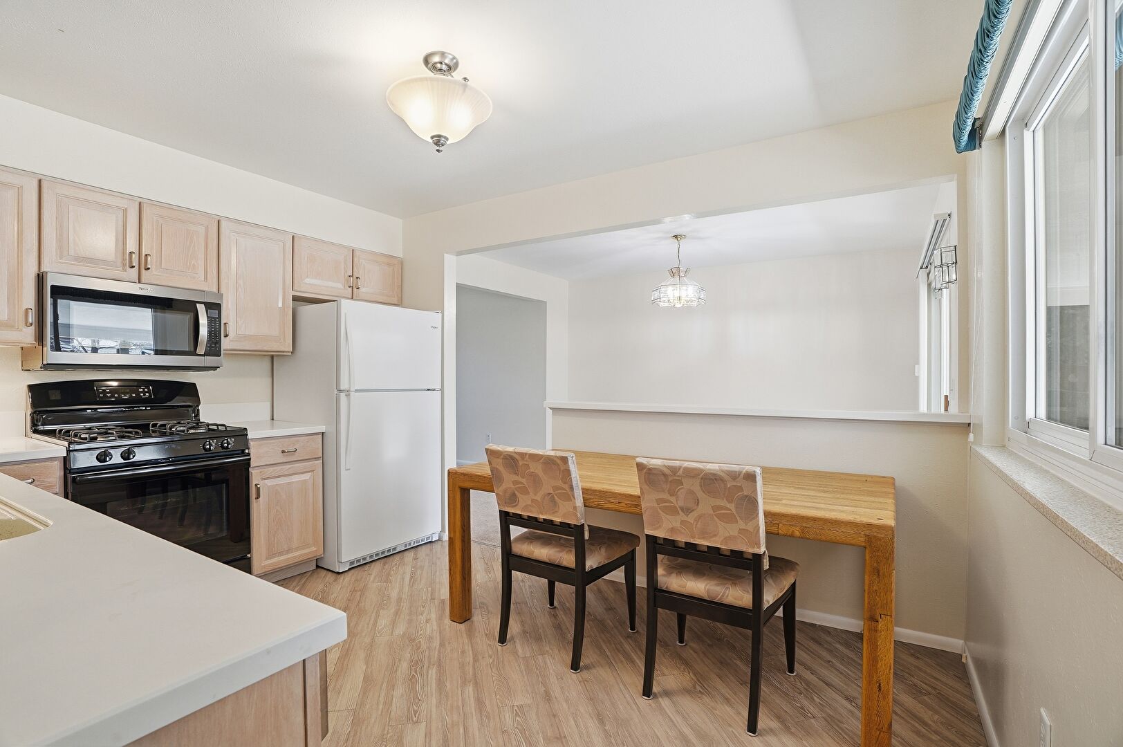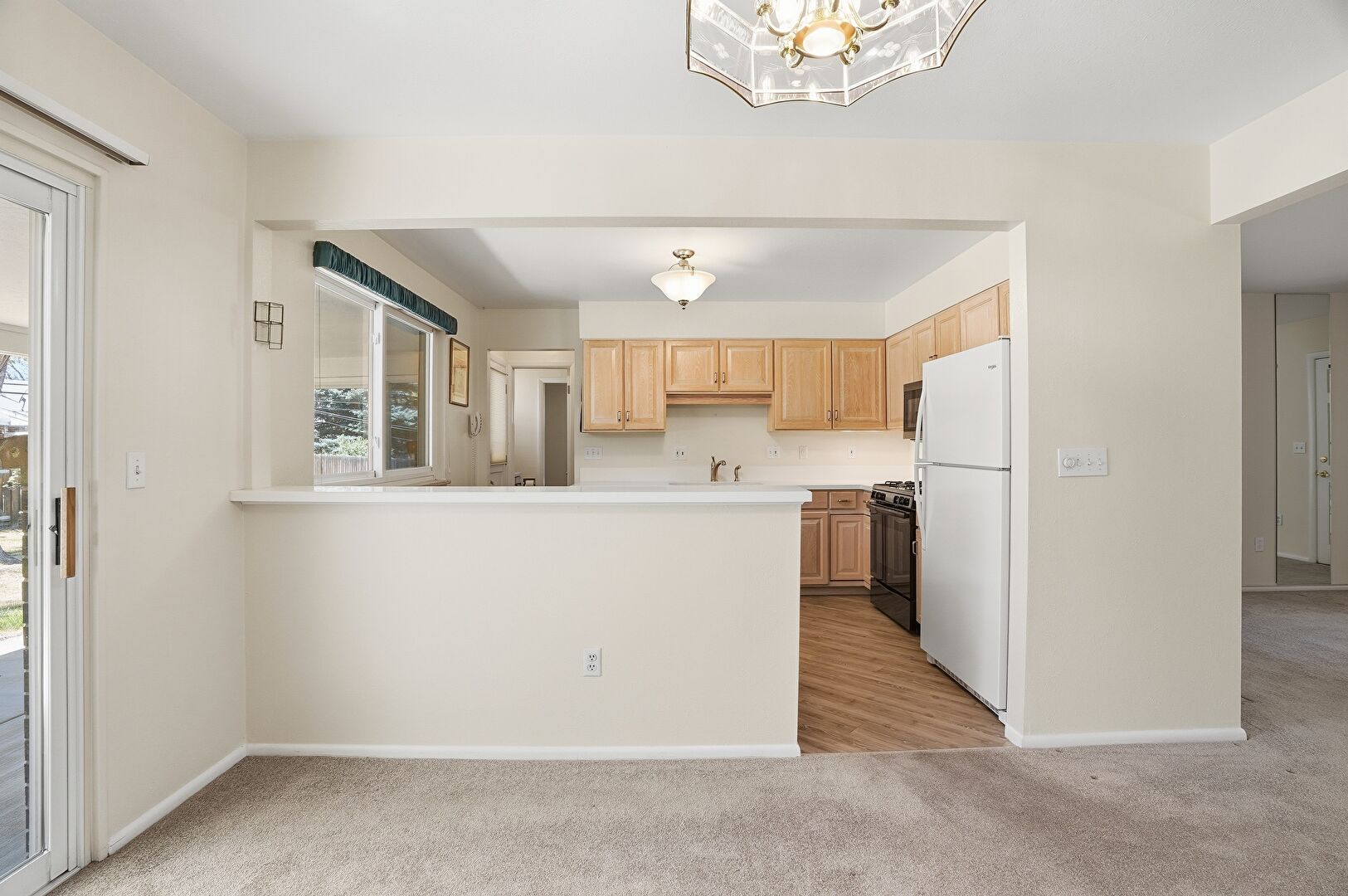 Baseboards Wall, Butcher Block Countertops, Carpet, Drywall, Kitchen Peninsula, Natural Light, Notable Chandelier, Pass Through Window, Pendant Lighting, Raised Cabinets, G Shaped Kitchen, Wood Finish Floor