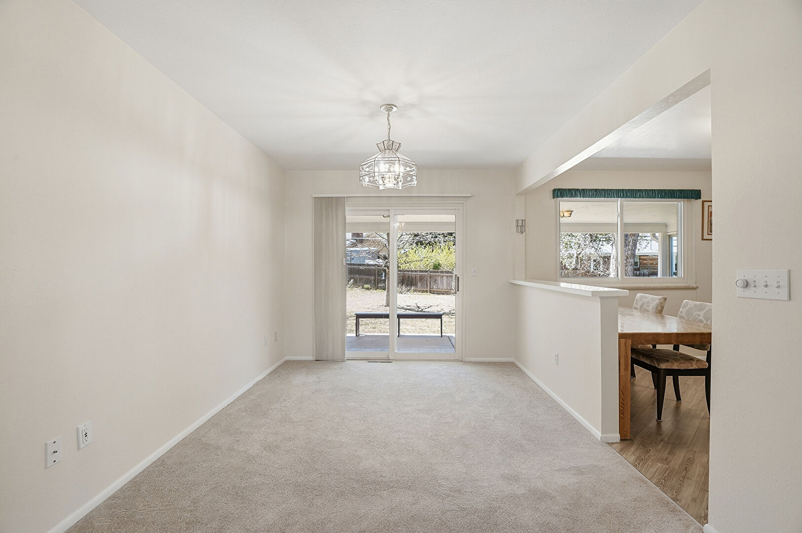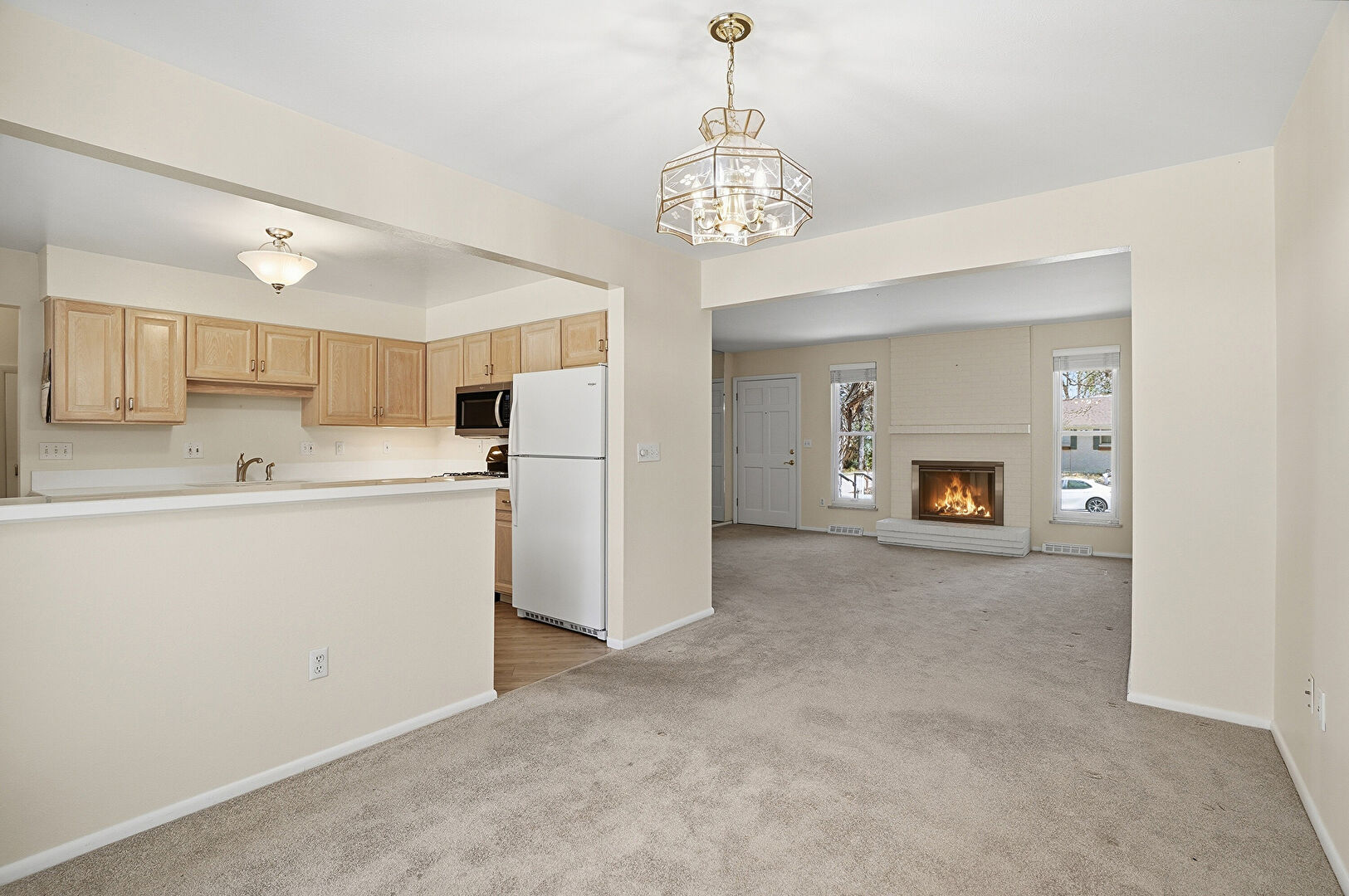 Baseboards Wall, Carpet, Drywall, Fireplace, Natural Light, Notable Chandelier, Opens To Living Area, Pendant Lighting, Shaker Cabinets, Natural Light, Raised Cabinets