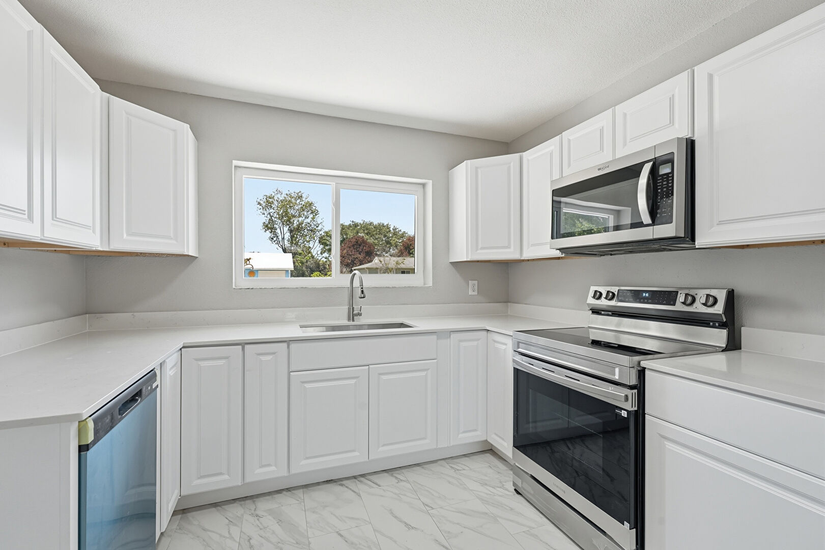 Drywall, Kitchen Bar, Kitchen Peninsula, Marble Finish Floor, Natural Light, Raised Cabinets, Stone Countertops, Vent, G Shaped Kitchen, Raised Cabinets