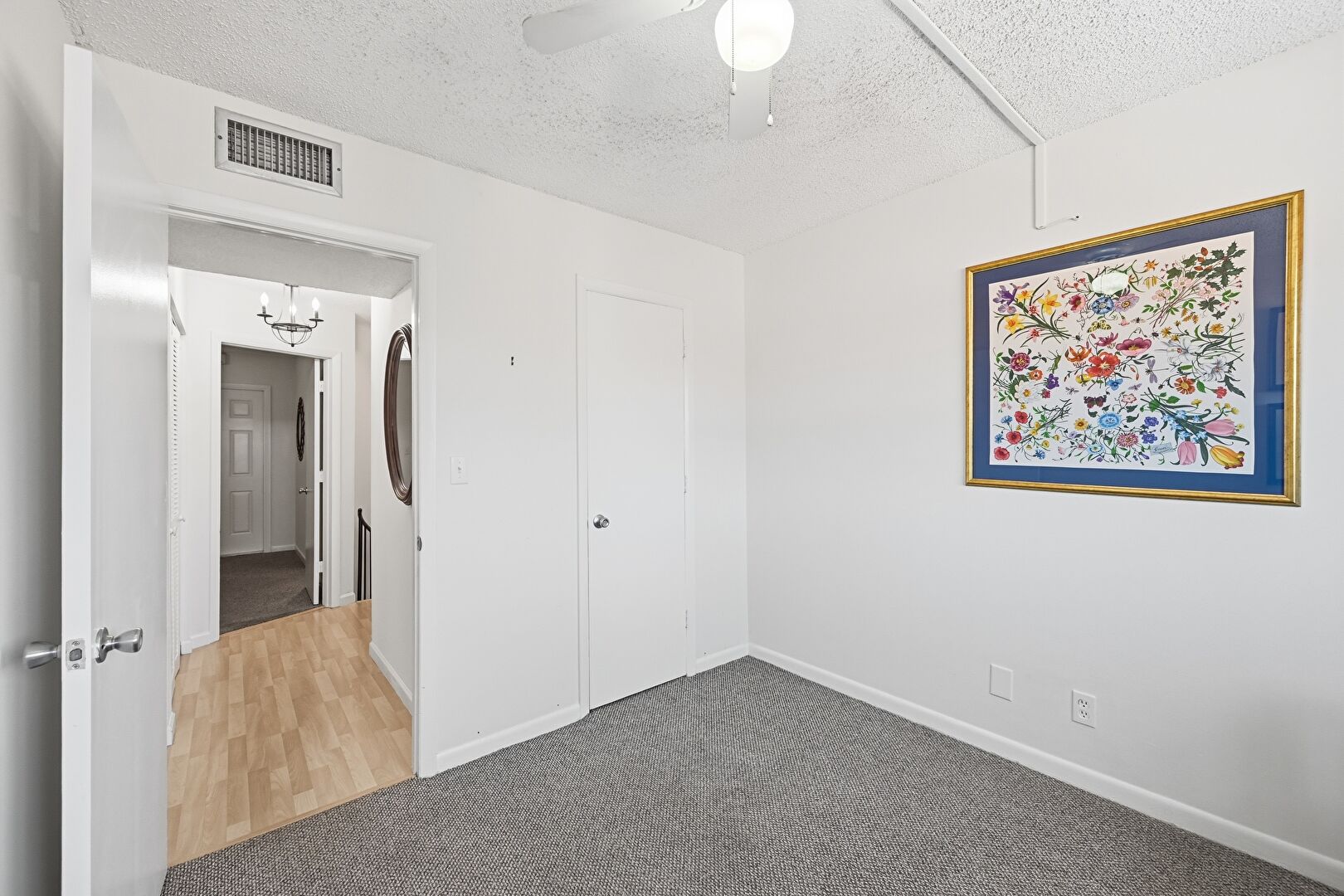 Baseboards Wall, Carpet, Ceiling Fan, Drywall, Ensuite Bathroom, Natural Light, Notable Chandelier, Textured Ceiling, Vent, Carpet, Drywall, Textured Ceiling, Vent